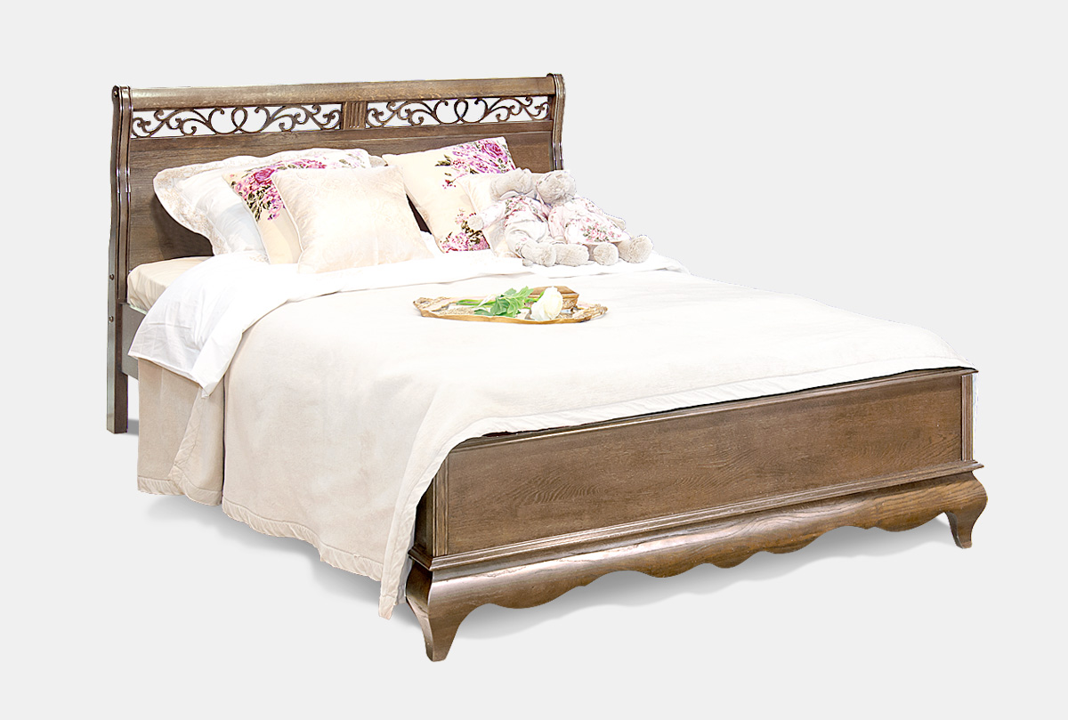 Двуспальная кровать «Тэфи» (1800x2000) с низким изножьем в цвете «амбэр с белой патиной» из массива дуба поражает воображение ясными пропорциями и утонченным изяществом резной спинки.