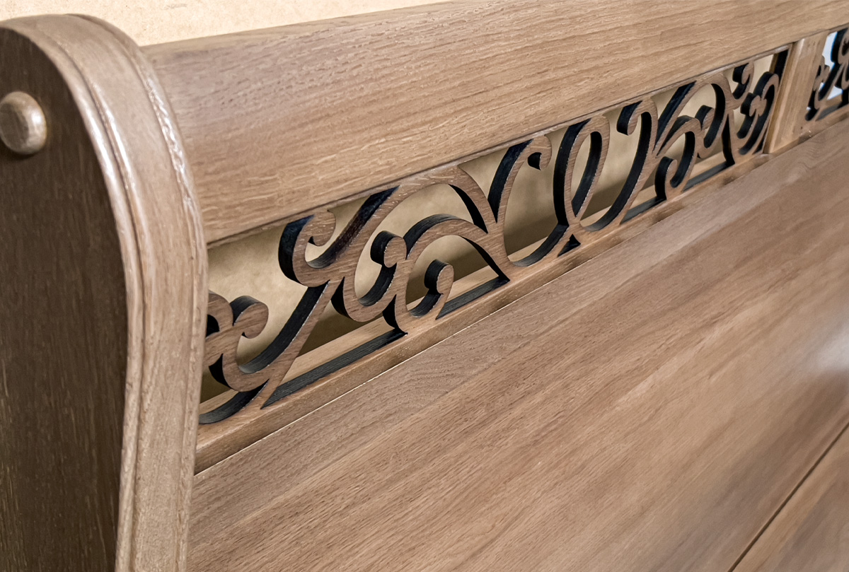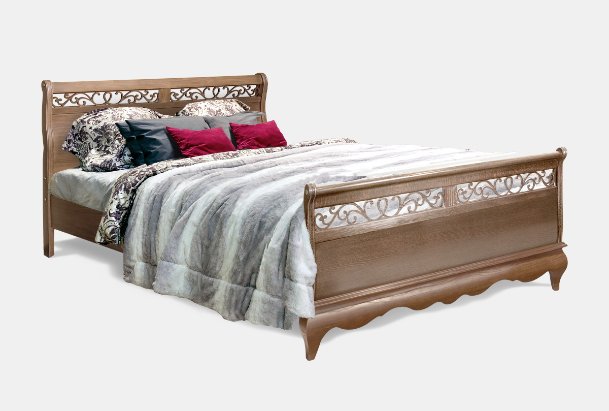 ✅ Гнутое изголовье с ажурной резьбой в верхней части.