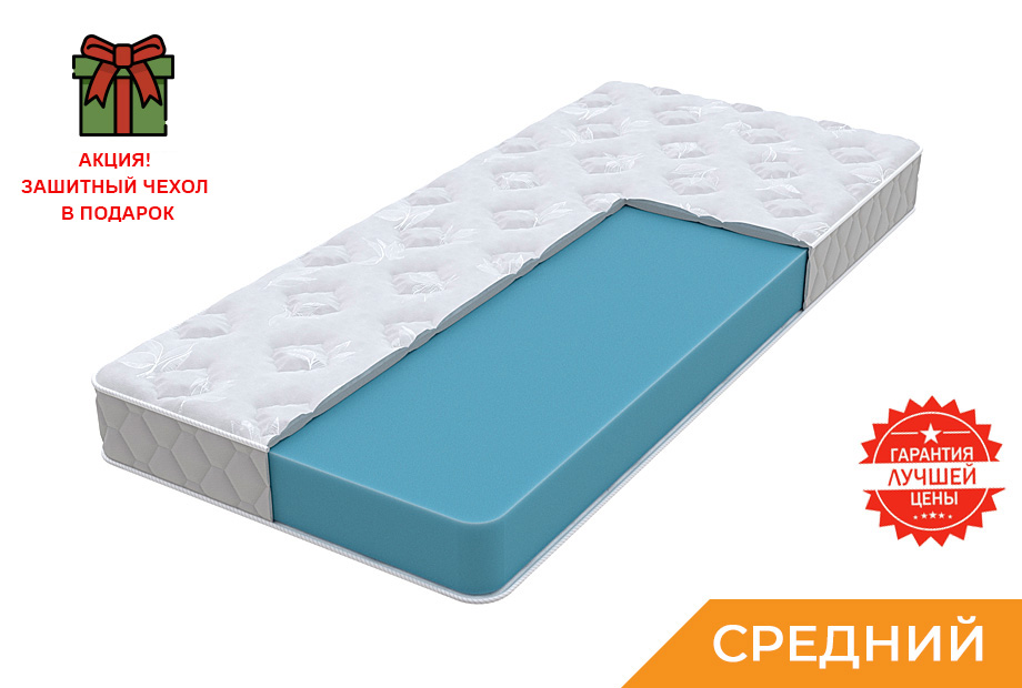 Беспружинный матрас средней жесткости, выполненный из монолитного блока современной пены повышенной плотности. Она служит надежной опорой и при этом подстраивается под очертания тела, поддерживая его в физиологически правильном положении. Ее пористая структура способствует влаго- и воздухообмену, сохраняя оптимальный для сна микроклимат на протяжении всей ночи. Чехол выполнен из белого приятного на ощупь трикотажа, простеганного на объемном волокне и дополнительном слое пены, а бурлет — из мягкой велюровой ткани благородного стального цвета.