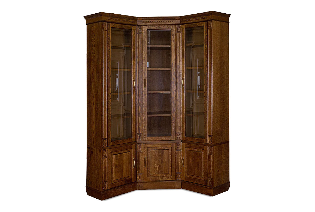 Угловой набор мебели для библиотеки «Верди Люкс 1» обязательно понравится тем, кто не мыслит своей жизни без книг. Благодаря тому, что верхняя секция оснащена стеклянными дверками, Вы сможете без труда найти нужное издание. Полки, регулируемые по высоте, без труда поместят всю семейную библиотеку. Фигурный цоколь и резные пилястры дополняют образ изделия, делая его законченным.