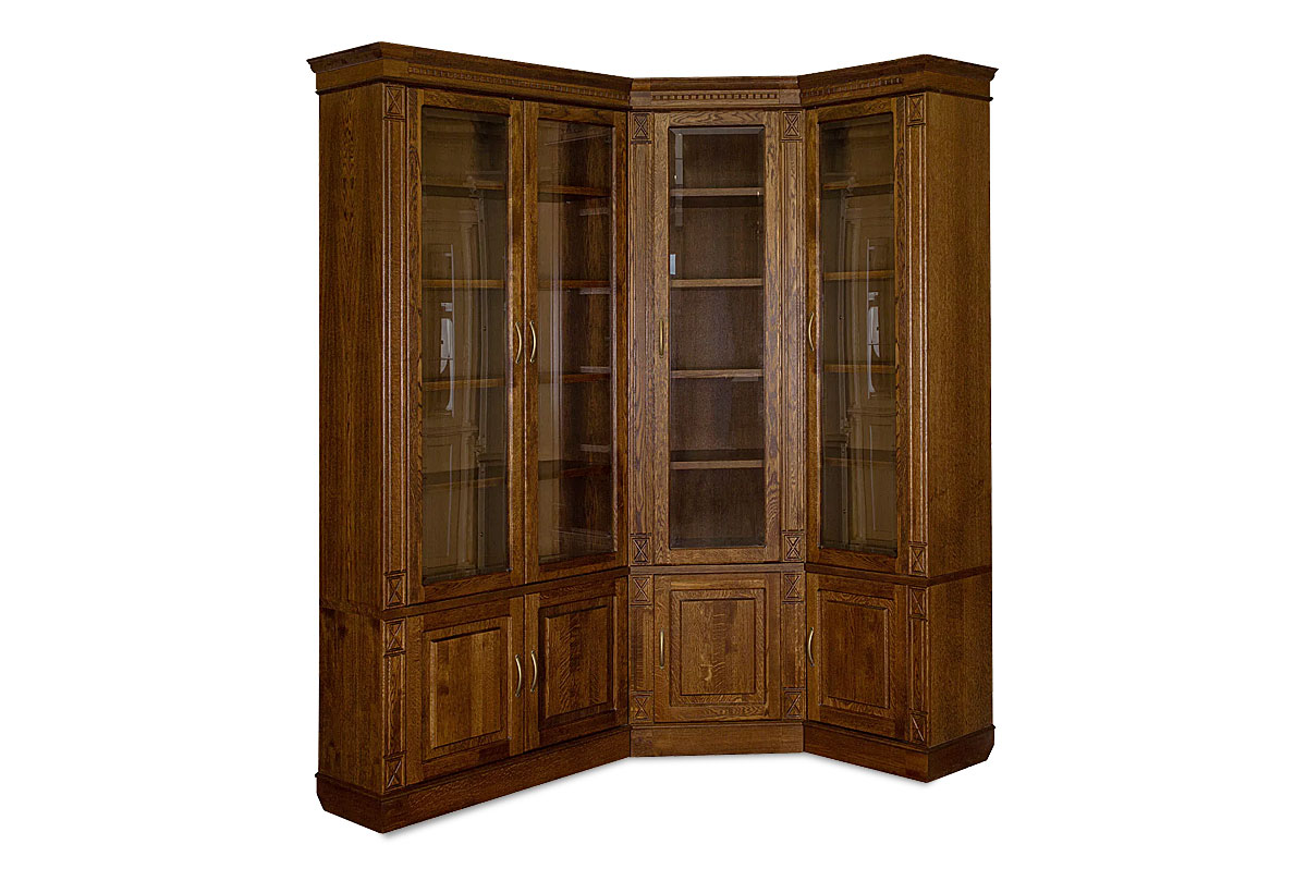 Угловой шкаф для библиотеки «Верди Люкс 2» обязательно понравится тем, кто не мыслит своей жизни без книг. Благодаря тому, что верхняя секция оснащена стеклянными дверками, Вы сможете без труда найти нужное издание. Полки, регулируемые по высоте, без труда поместят всю семейную библиотеку. Фигурный цоколь и резные пилястры дополняют образ изделия, делая его законченным.