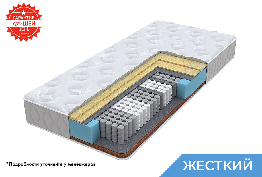 Матрас высокой жесткости, которую обеспечивают кокосовая койра и сизаль, прочные природные материалы. Они также хорошо пропускают воздух, способствуя постоянной вентиляции и сохранению гигиены спального места. Основу матраса составляет зональный блок независимых пружин, который грамотно распределяет нагрузку по всей поверхности и служит надежной опорой во время отдыха. Особый комфорт придает пышный трикотажный чехол с дополнительным объемным волокном и слоем мягкой упругой пены внутри. Бурлет выполнен из прочной мебельной ткани, что делает матрас более долговечным и износостойким.