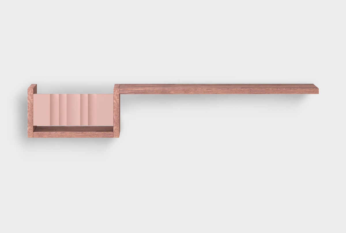 Левая полка с нишей «Меридиан» изготовлена из дуба. Корпус полки выполнен в цвете «шоколадный дуб», а вставка — в оттенке «дымчатая роза».