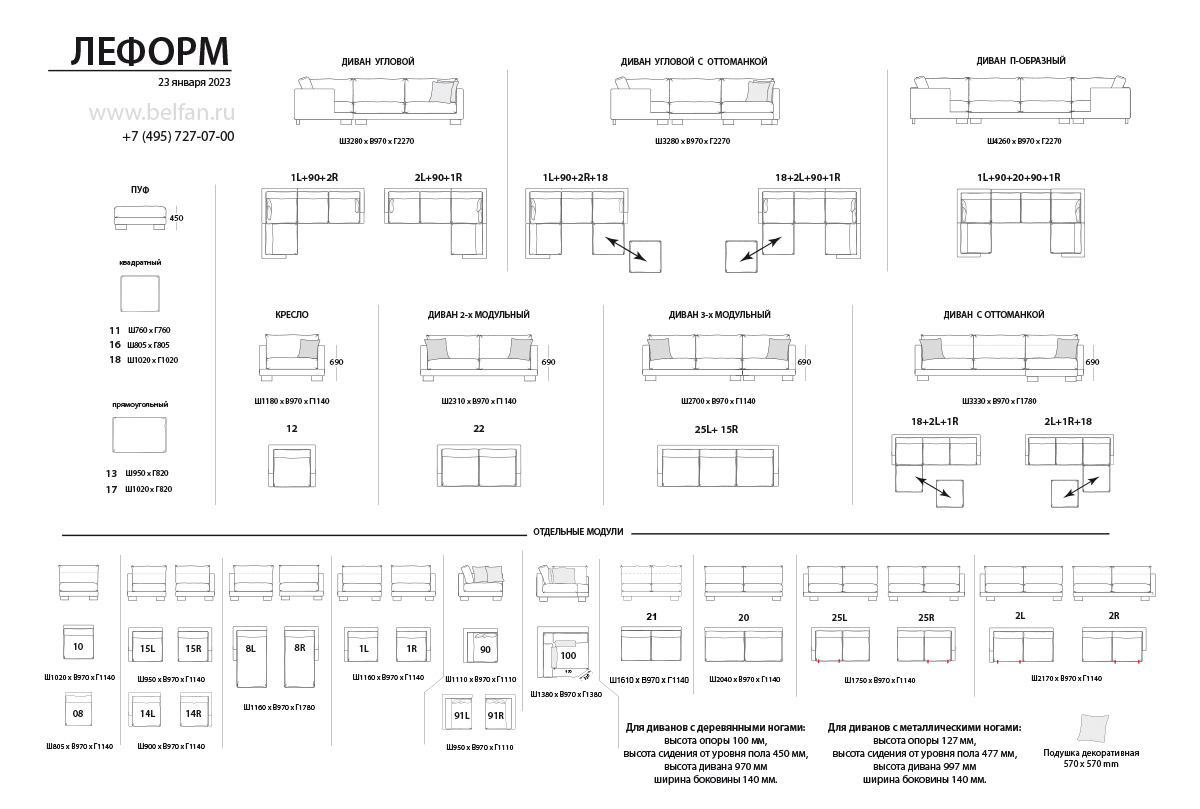 ✅ Для модулей с металлическими опорами: Высота опоры – 127 мм. Высота посадочного места – 477 мм. Высота дивана – 997 мм.