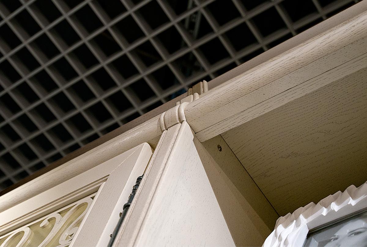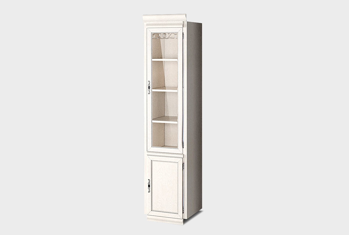 Правый однодверный шкаф со стеклом «Тэфи» в цвете «белая эмаль с темной патиной» из массива и шпона дуба станет прекрасным дополнением к гостиной или кабинету в классическом стиле.