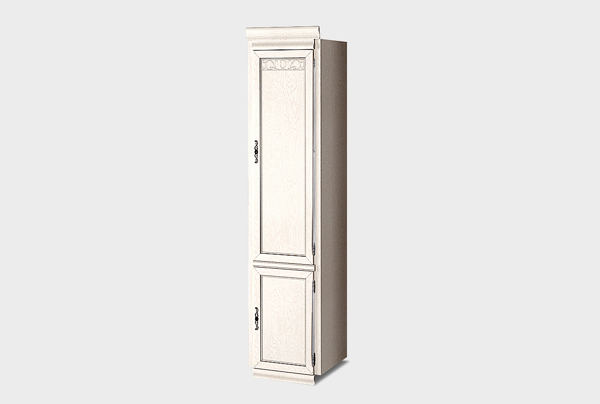 Правый однодверный шкаф Тэфи» в цвете «белая эмаль с темной патиной» из массива и шпона дуба станет прекрасным дополнением к гостиной или кабинету в классическом стиле.