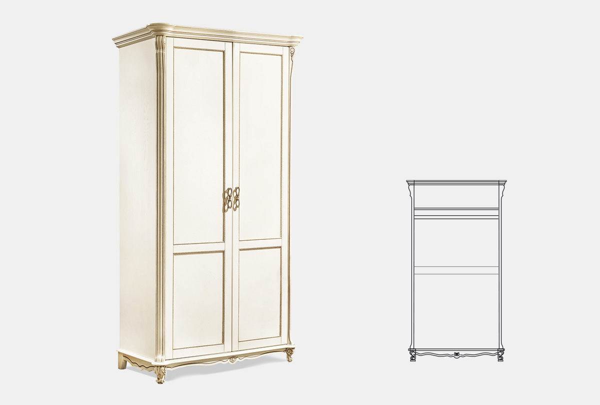 Двухдверный шкаф «Алези» без зеркала в цвете «слоновая кость с золочением». Внутреннее напонение - отделение со штангой. Вручную нанесенная золотая патина.