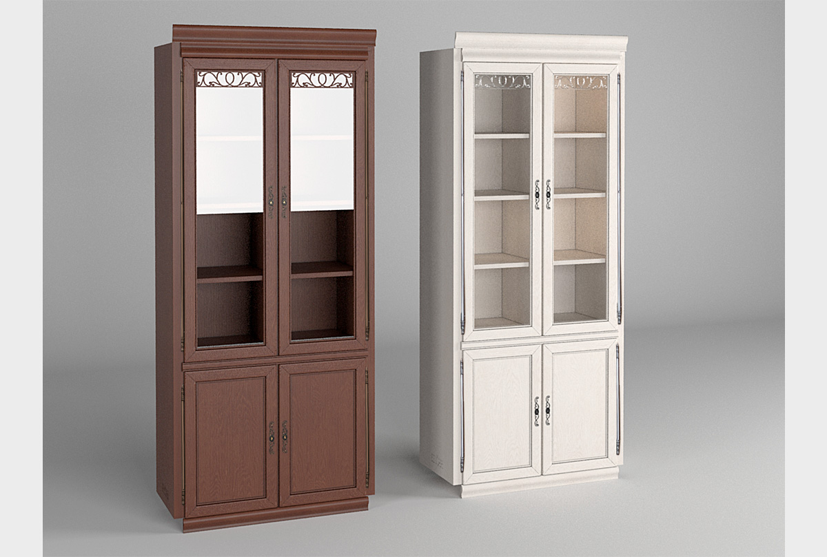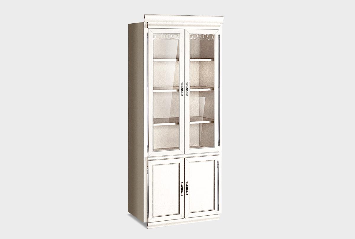 Шкаф 2-х дверный со стеклом «Тэфи» в цвете «белая эмаль с темной патиной» из массива и шпона дуба станет прекрасным дополнением к кабинету в классическом стиле.