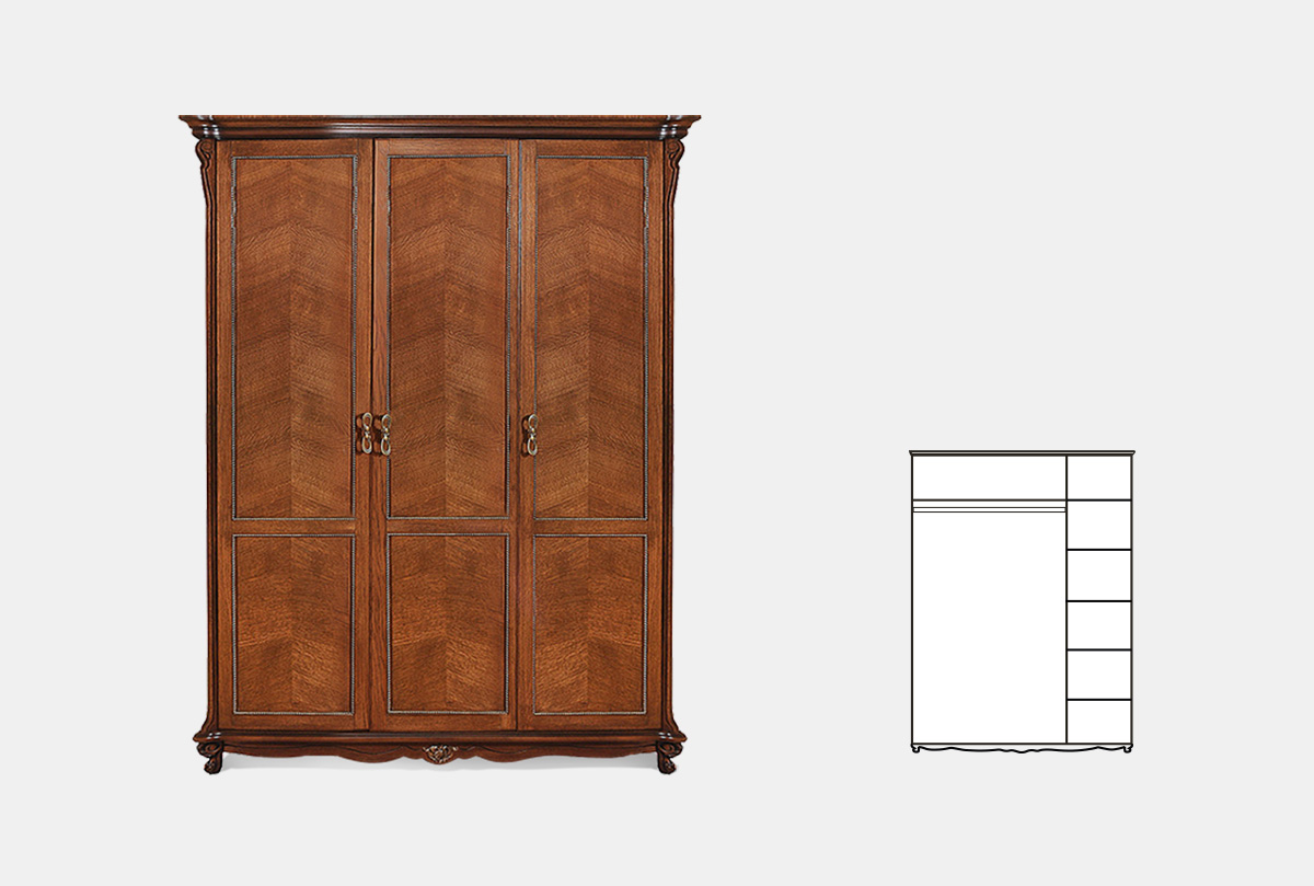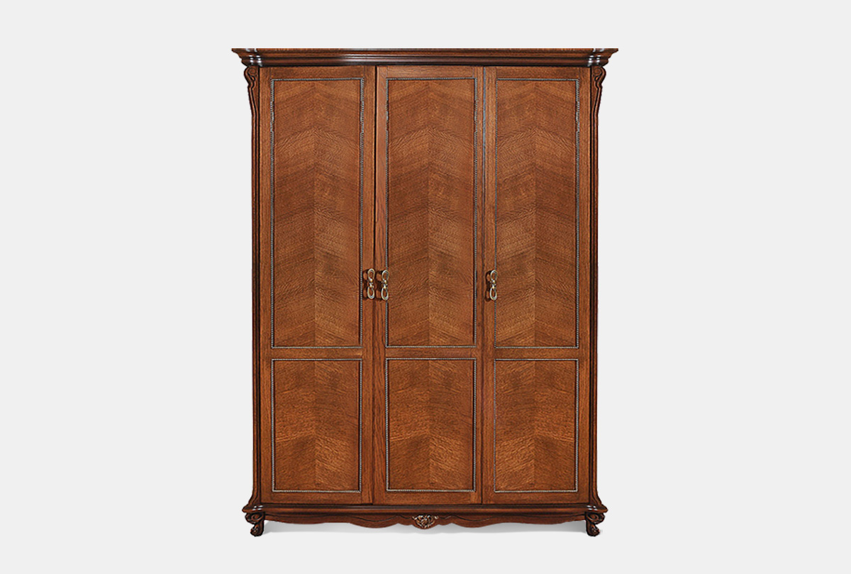 Массивный, но при этом изящный и элегантный трёхдверный шкаф для одежды без зеркала из коллекции «Алези» в цвете «античная бронза» подойдет как для городской квартиры, так и для загородного дома. Основательные формы компенсируются обилием декоративных элементов: ажурные пилястры, инкрустации по технологии маркетри и фигурный цоколь с резьбой в виде волны делают шкаф более «легким». Продуманное внутреннее наполнение позволяет разместить в шкафу вещи всей семьи.