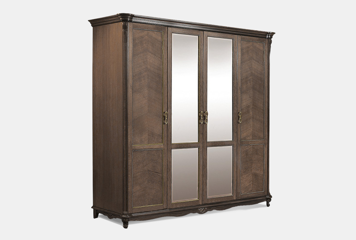 Четырёхдверный шкаф для одежды «Алези» (Alezi) подойдет как для городской квартиры, так и для загородного дома. Основательные формы компенсируются обилием декоративных элементов: ажурные пилястры, инкрустации по технологии маркетри и фигурный цоколь с резьбой в виде волны делают шкаф более «легким». Продуманное внутреннее наполнение позволяет разместить в шкафу вещи всей семьи.
