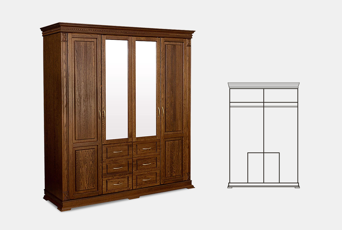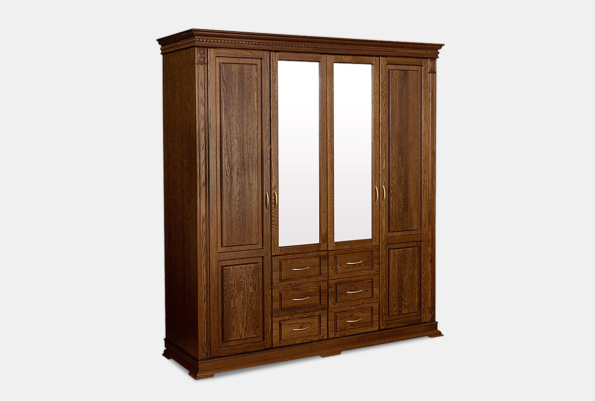 Четырехдверный шкаф из коллекции «Верди Люкс» - это идеальный баланс красоты и эргономичности. Утонченность классики представлена в виде фигурного цоколя, резных пилястр и благородных цветов крашения, которые подчеркивают природную красоту дерева. Внутреннее наполнение в виде выдвижных ящиков, полок и штанги для одежды обеспечивают комфорт эксплуатации. Украшение шкафа – зеркало с фацетом, который создает дополнительную игру света.