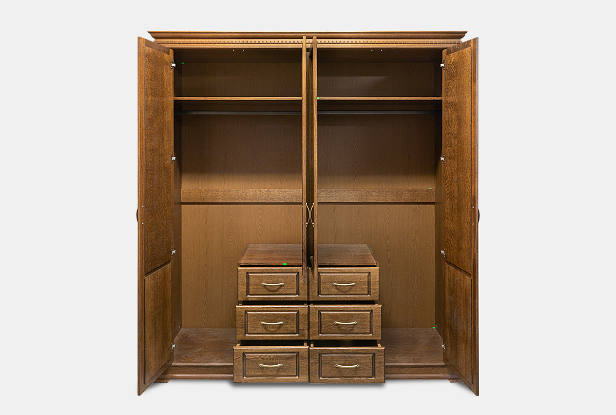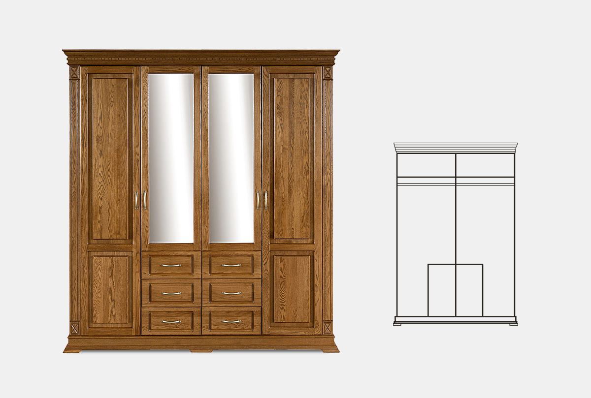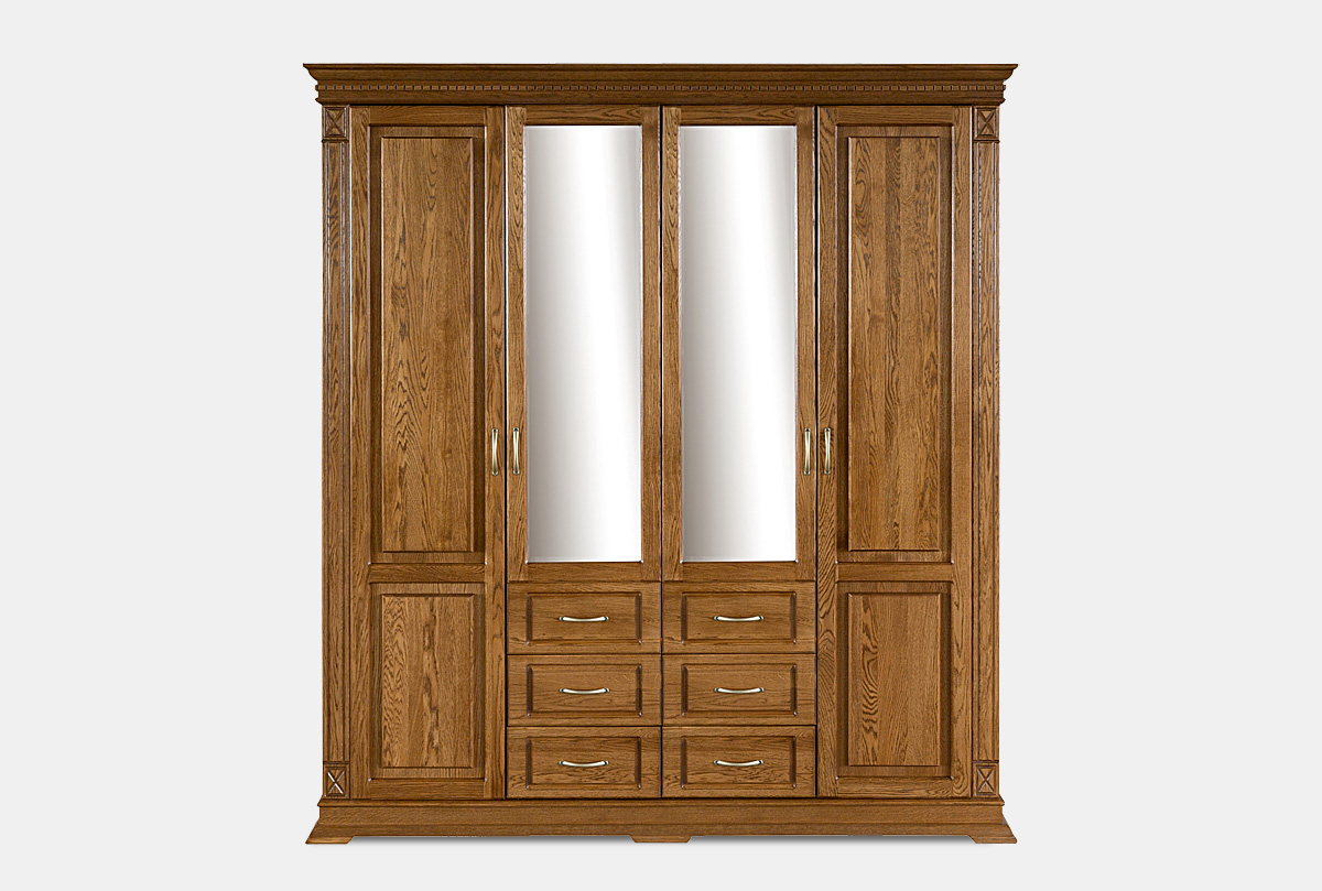 Четырехдверный шкаф из коллекции «Верди Люкс» - это идеальный баланс красоты и эргономичности. Утонченность классики представлена в виде фигурного цоколя, резных пилястр и благородных цветов крашения, которые подчеркивают природную красоту дерева. Внутреннее наполнение в виде выдвижных ящиков, полок и штанги для одежды обеспечивают комфорт эксплуатации. Украшение шкафа – зеркало с фацетом, который создает дополнительную игру света.