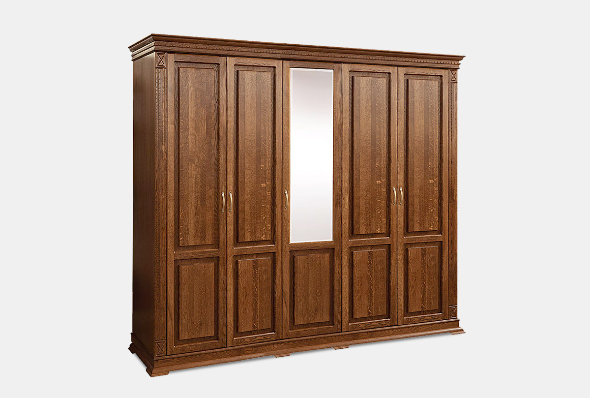 Пятидверный шкаф из коллекции «Верди Люкс» - это идеальный баланс красоты и эргономичности. Утонченность классики представлена в виде фигурного цоколя, резных пилястр и благородных цветов крашения, которые подчеркивают природную красоту дерева. Внутреннее наполнение в виде выдвижных ящиков, полок и штанги для одежды обеспечивают комфорт эксплуатации. Украшение шкафа – зеркало с фацетом, который создает дополнительную игру света.