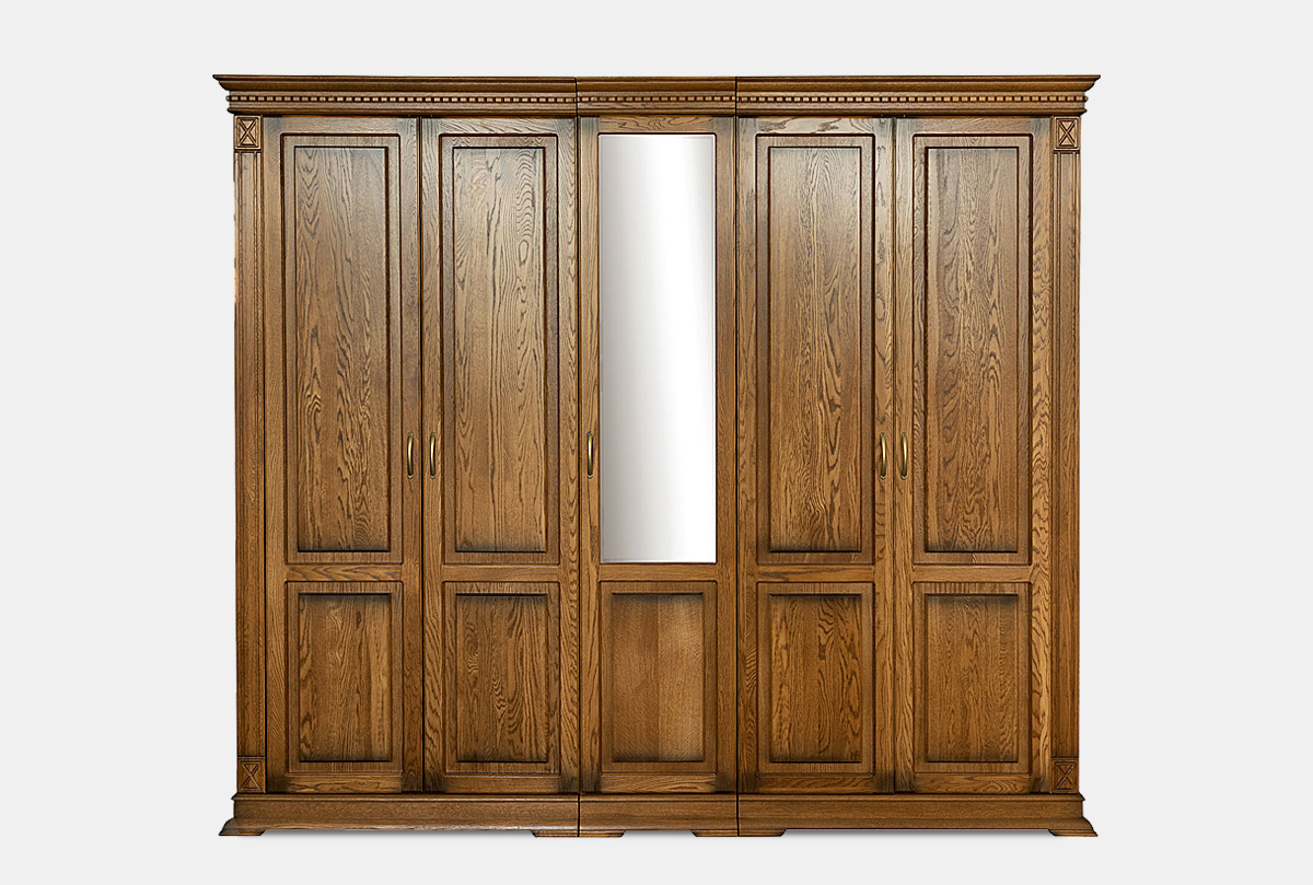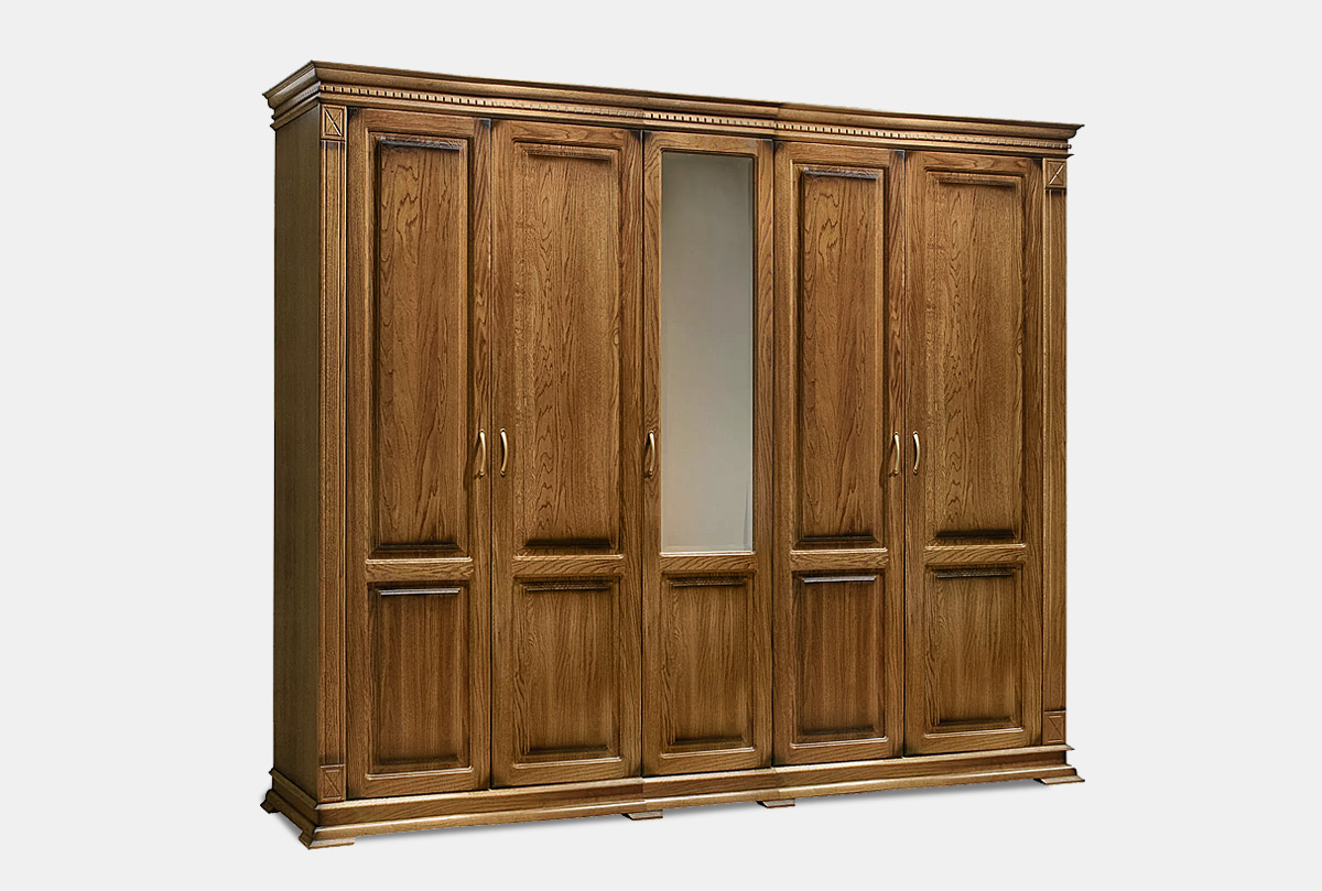 Пятидверный шкаф из коллекции «Верди Люкс» - это идеальный баланс красоты и эргономичности. Утонченность классики представлена в виде фигурного цоколя, резных пилястр и благородных цветов крашения, которые подчеркивают природную красоту дерева. Внутреннее наполнение в виде выдвижных ящиков, полок и штанги для одежды обеспечивают комфорт эксплуатации. Украшение шкафа – зеркало с фацетом, который создает дополнительную игру света.