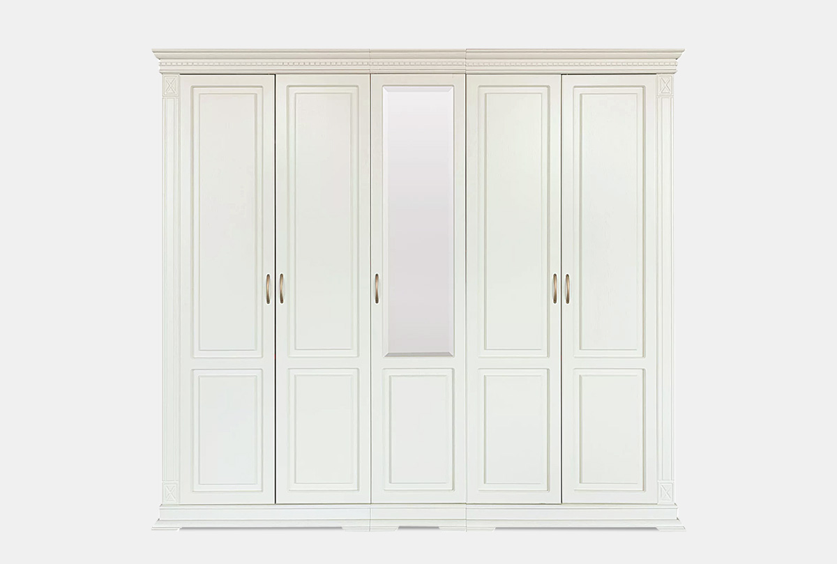 Пятидверный шкаф из коллекции «Верди Люкс» - это идеальный баланс красоты и эргономичности. Утонченность классики представлена в виде фигурного цоколя, резных пилястр и благородных цветов крашения, которые подчеркивают природную красоту дерева. Внутреннее наполнение в виде выдвижных ящиков, полок и штанги для одежды обеспечивают комфорт эксплуатации. Украшение шкафа – зеркало с фацетом, который создает дополнительную игру света.