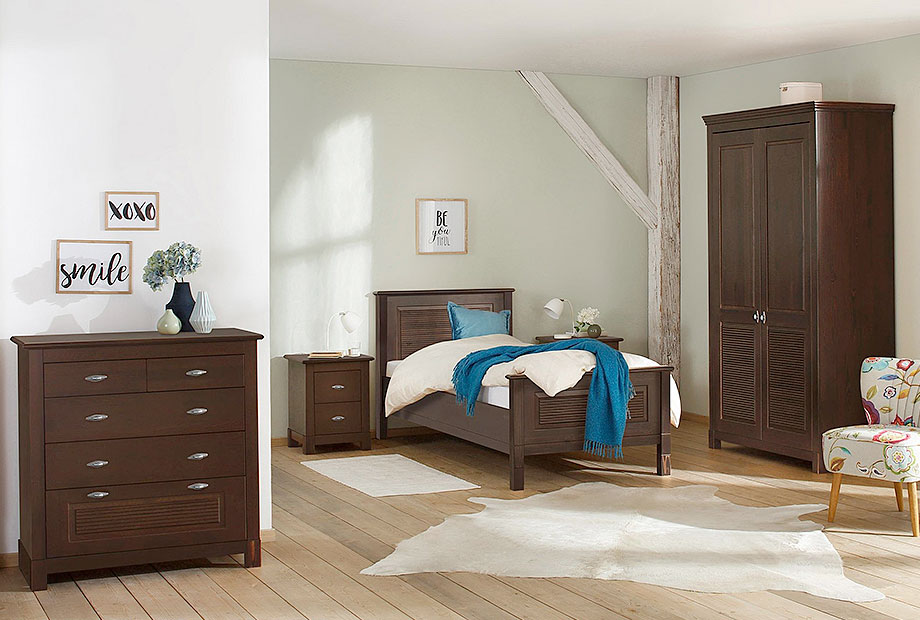 Двухдверный шкаф «Рауна» 20 для спальни в стиле Прованс предлагает достаточно места для ваших вещей. За двумя дверями вы можете прекрасно хранить футболки, свитера или брюки на трех регулируемых полках. Блузки, рубашки и платья находят свое место на штанге для одежды.