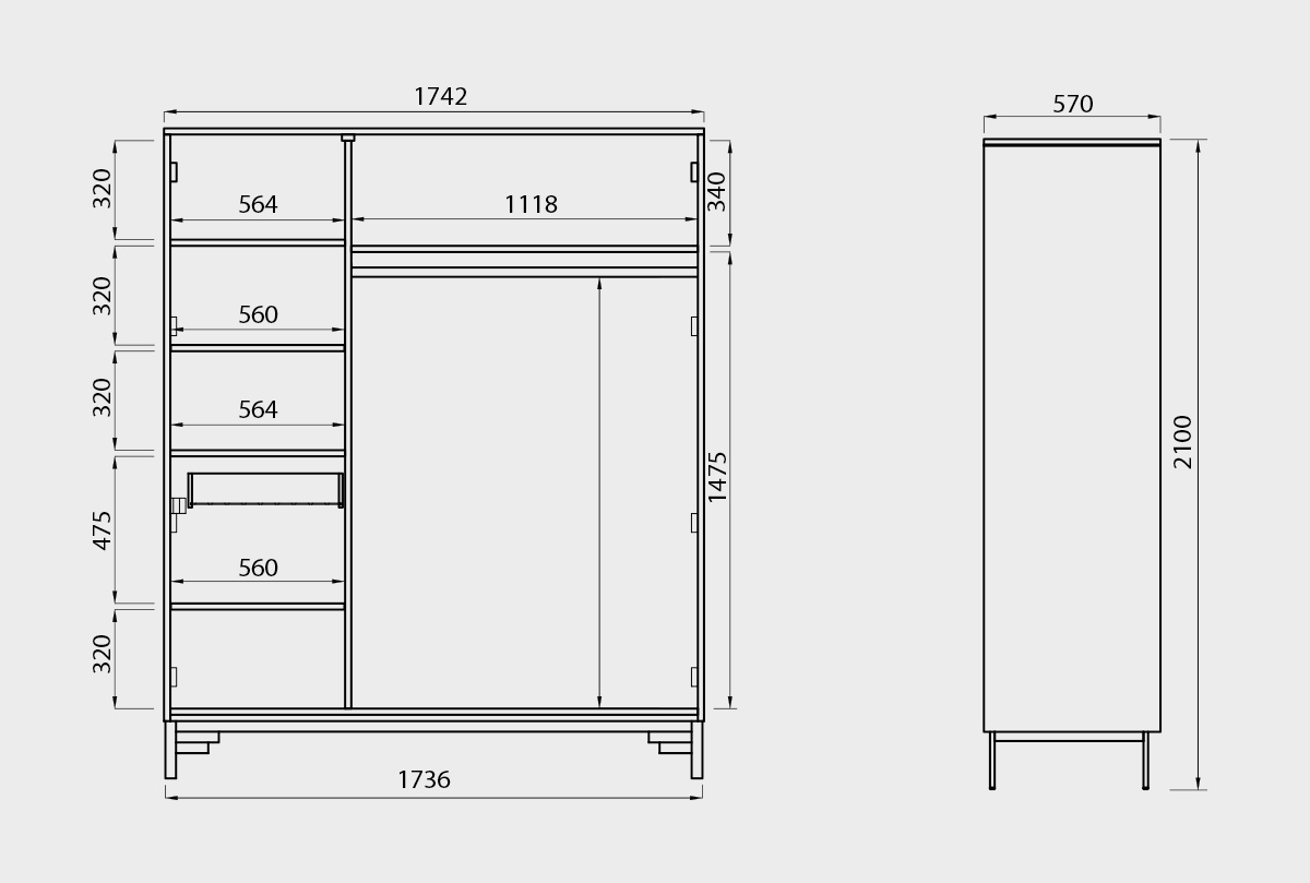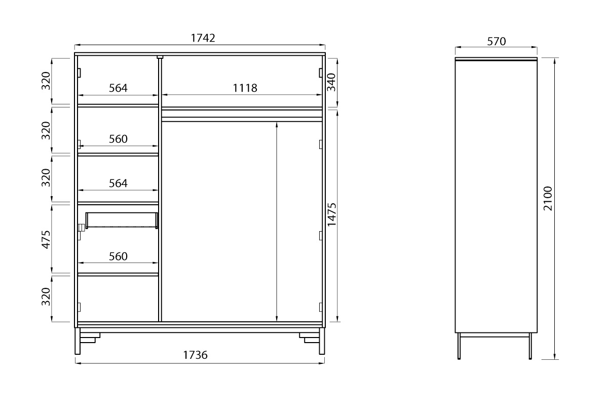 ✅ Внутренне наполнение: в левой секции 4 полки и 1 выдвижной ящик посередине, правая и центральная секция объединены полкой-антресолью и штангой).