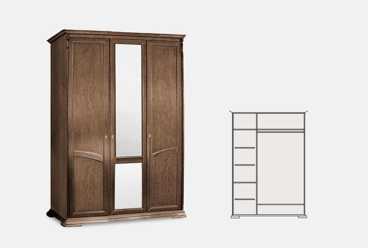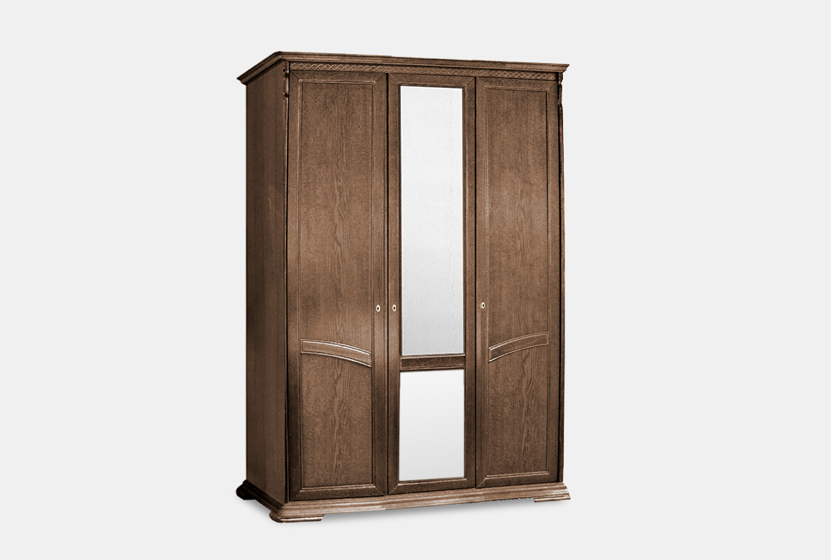 Особенности шкафа для одежды трехдверного «Лика» (с зеркалом) в цвете «табак с тёмной патиной»: