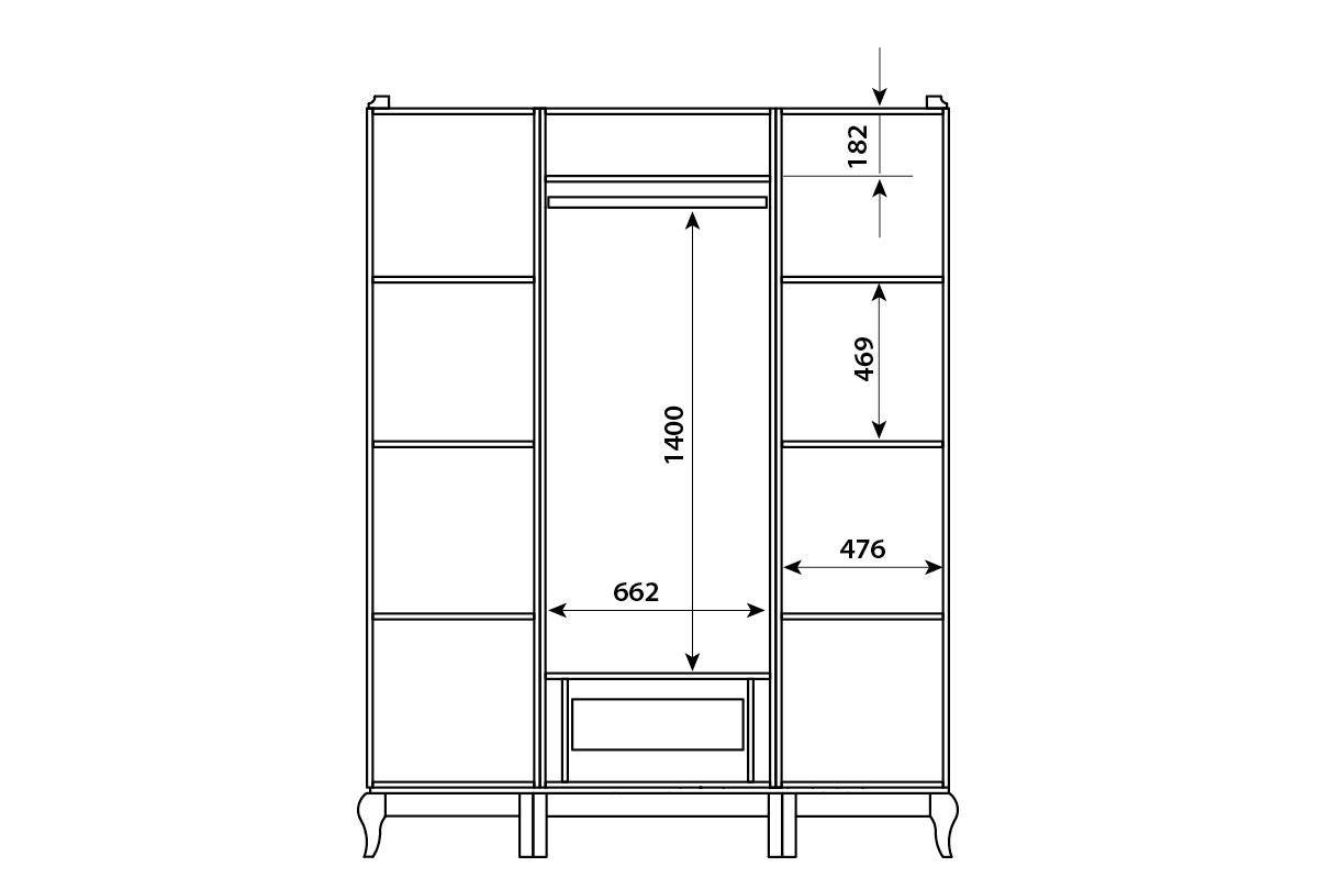 ✅ Продуманное внутреннее наполнение шкафа Sonata позволяет аккуратно распределить все вещи и поддерживать порядок в нем. Левая и правая секции: полки. Центральная секция: выдвижной ящик, штанга и одна полка над ней.