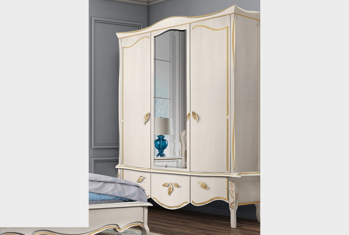 Особенности распашного трёхдверного шкафа для одежды «Трио» в цвете «белая эмаль с золотой патиной»: