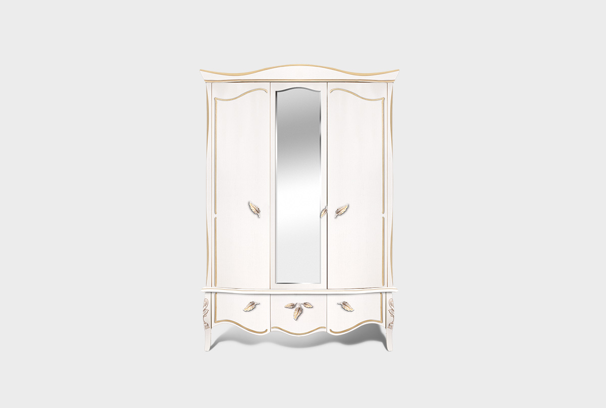 Особенности распашного трёхдверного шкафа для одежды «Трио» в цвете «белая эмаль с золотой патиной»:
