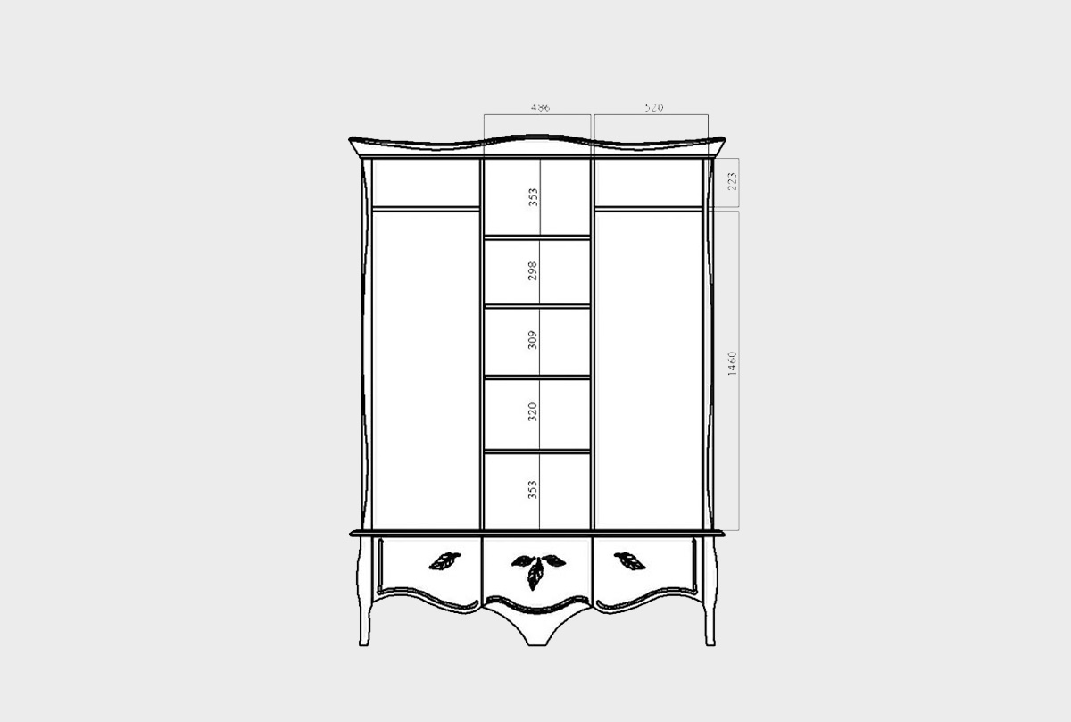 ✅ Изюминку дизайну шкафа придает волнообразная форма карниза из массива дуба с серебряной патиной.