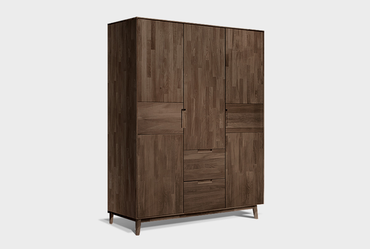 Шкаф для одежды 3-х дверный «Ирвинг» — это эстетика минимализма и утончённости в духе модерна середины века. Корпус и фасады изготовлены из массива дуба, чья текстура читается особенно выразительно благодаря экологичной отделке бейц-маслом. Вертикальные линии и аккуратные, почти незаметные ручки-ниши создают элегантный и графичный дизайн. Тонкие ножки из массива дуба визуально приподнимают шкаф над полом — он словно парит, не утяжеляя пространство.