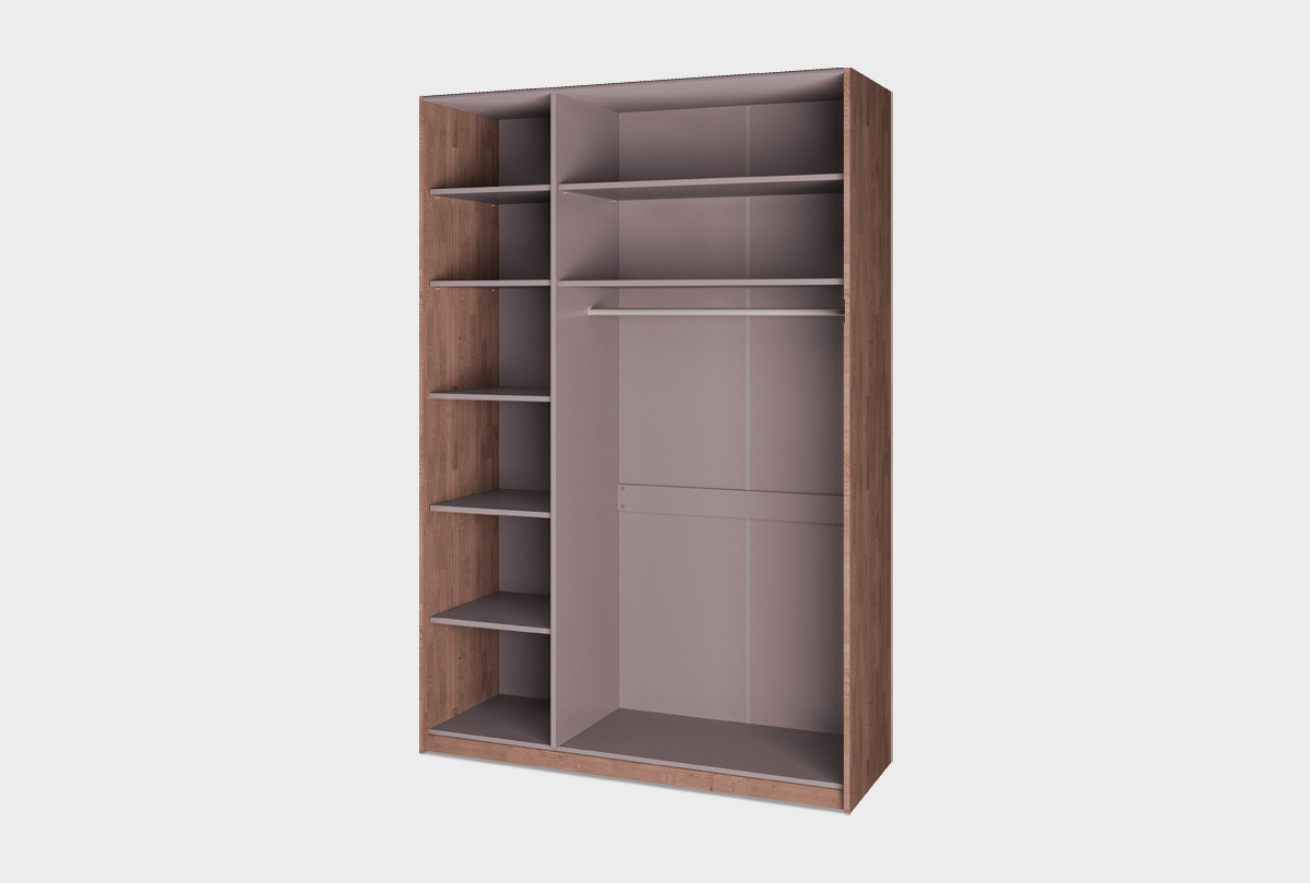 ✅ Внутреннее наполнение: удобные отделения с горизонтальными штангами для одежды на плечиках, полки для сложенных вещей и верхние полки для коробов или аксессуаров.
