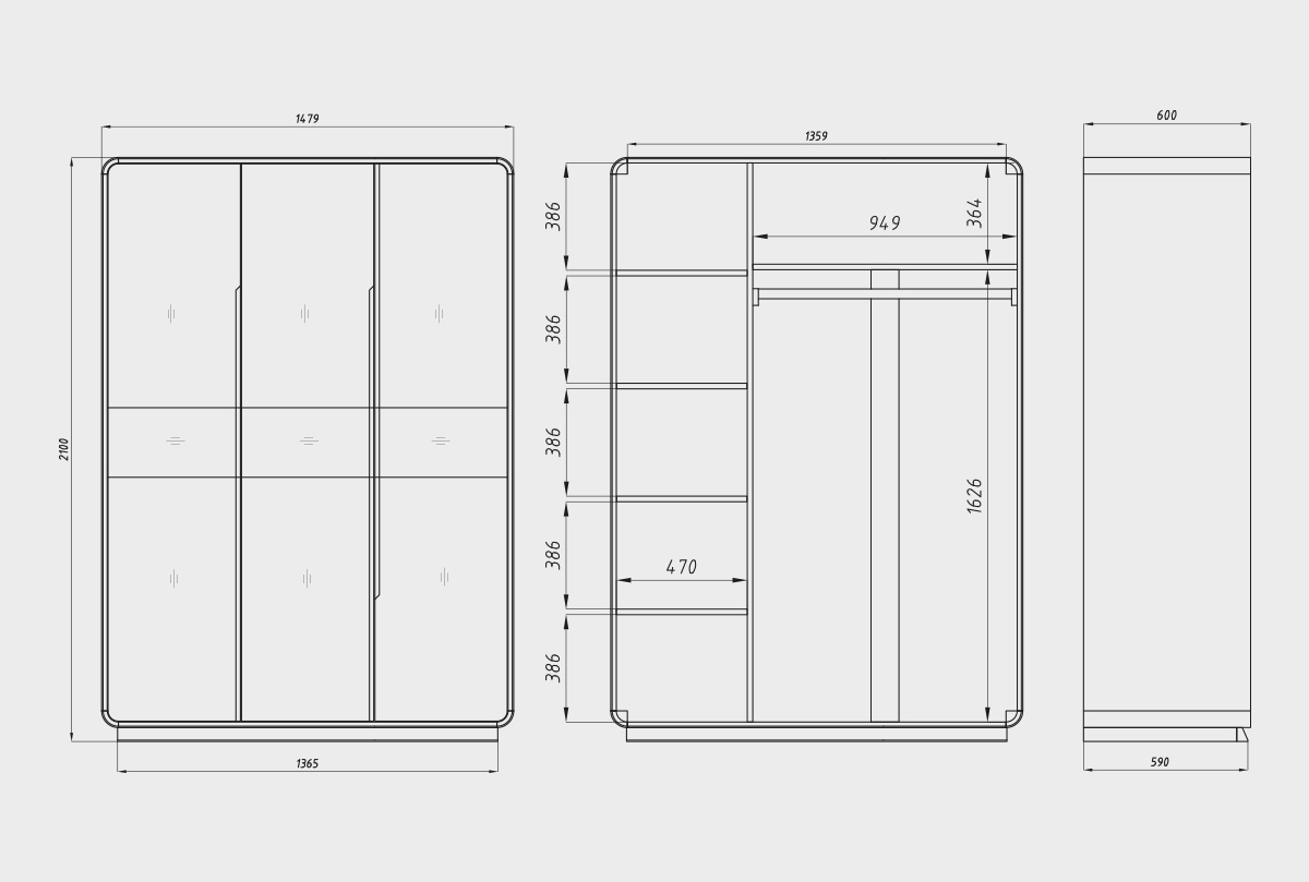 ✅ Размеры изделия: ширина 1479 мм, высота 2100 мм, глубина 600 мм.