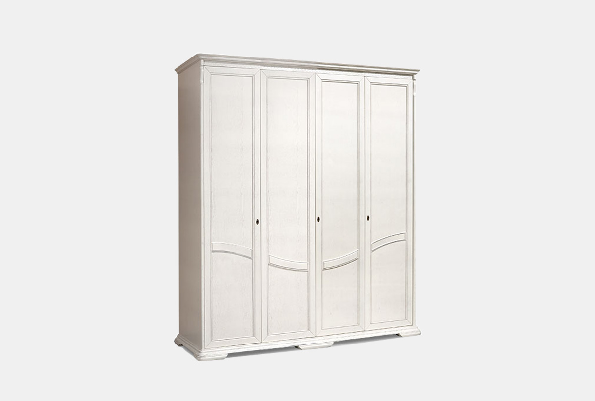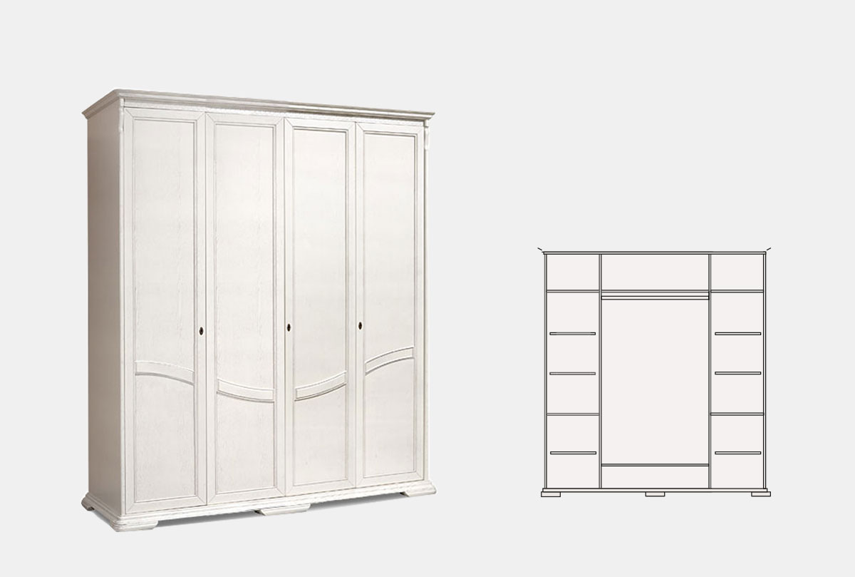 Качество, традиции, надежность – вот слова, уместные в описании 4-х дверного шкафа для одежды из классической коллекции «Лика» (Lika). Устойчивый нижний ножной пояс шкафа, сделанного из массива дуба, в цвете «белая эмаль» придает изделию незыблемость. Шкаф закрывается на ключ, при этом средняя секция оснащена штангой и полкой для шляп, а в правой и левой секциях расположены полки.