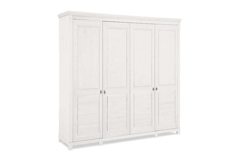 Четырехдверный шкаф для одежды «Рауна» 40 для спальни в стиле Прованс займет достойное место в вашем доме. За четырьмя распашными дверями вы найдете пространство для одежды со штангой, три регулируемые полки, секции для головных уборов и обуви. Это находка для тех, кто хотел бы грамотно организовать хранение всего своего гардероба, а также для семейного использования.