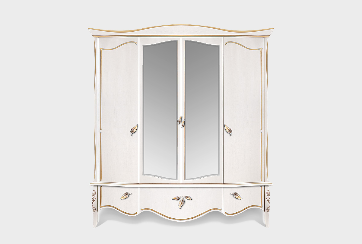 Четырехдверный шкаф из коллекции «Трио» в цвете «белая эмаль с золотой патиной» идеально подойдет для квартиры или загородного дома. Продуманное внутреннее наполнение позволит Вам распределить в нем вещи всей семьи: шкаф содержит три выдвижных ящика, штанги для одежды и полки. Шкаф декорирован резьбой и фурнитурой в виде лепестков. Изюминку дизайну придает волнообразная форма карниза.