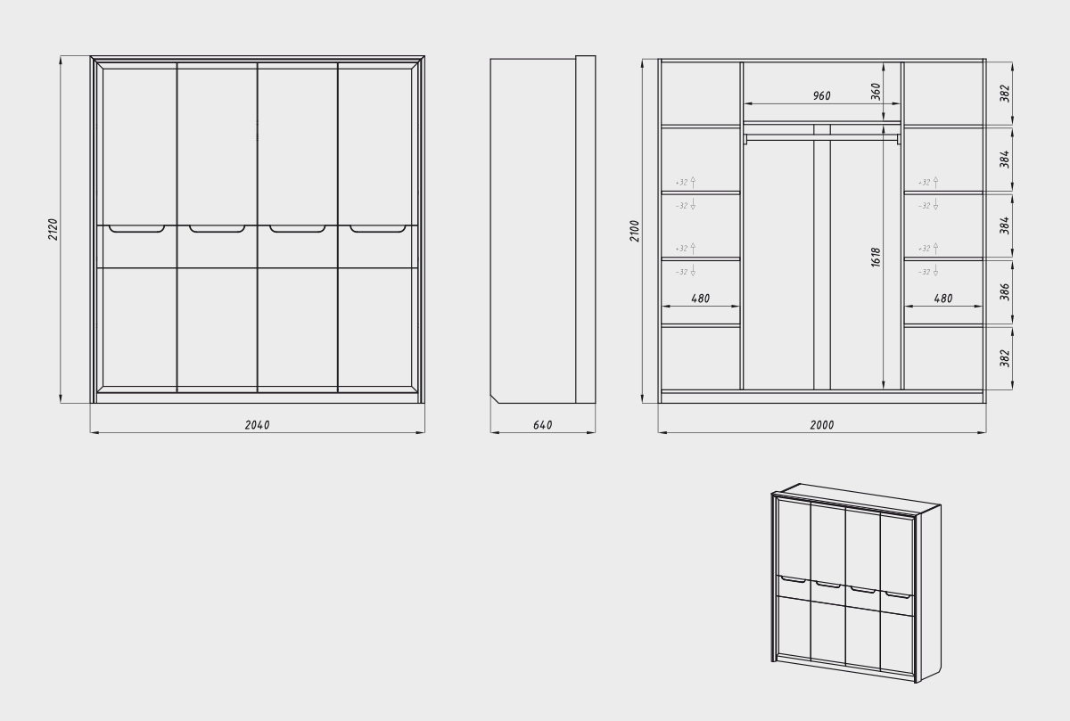 ✅ Продуманная глубина (640 мм) и высота (2120 мм) позволяют с комфортом разместить вещи разного формата, включая коробки, сумки и сезонную одежду.