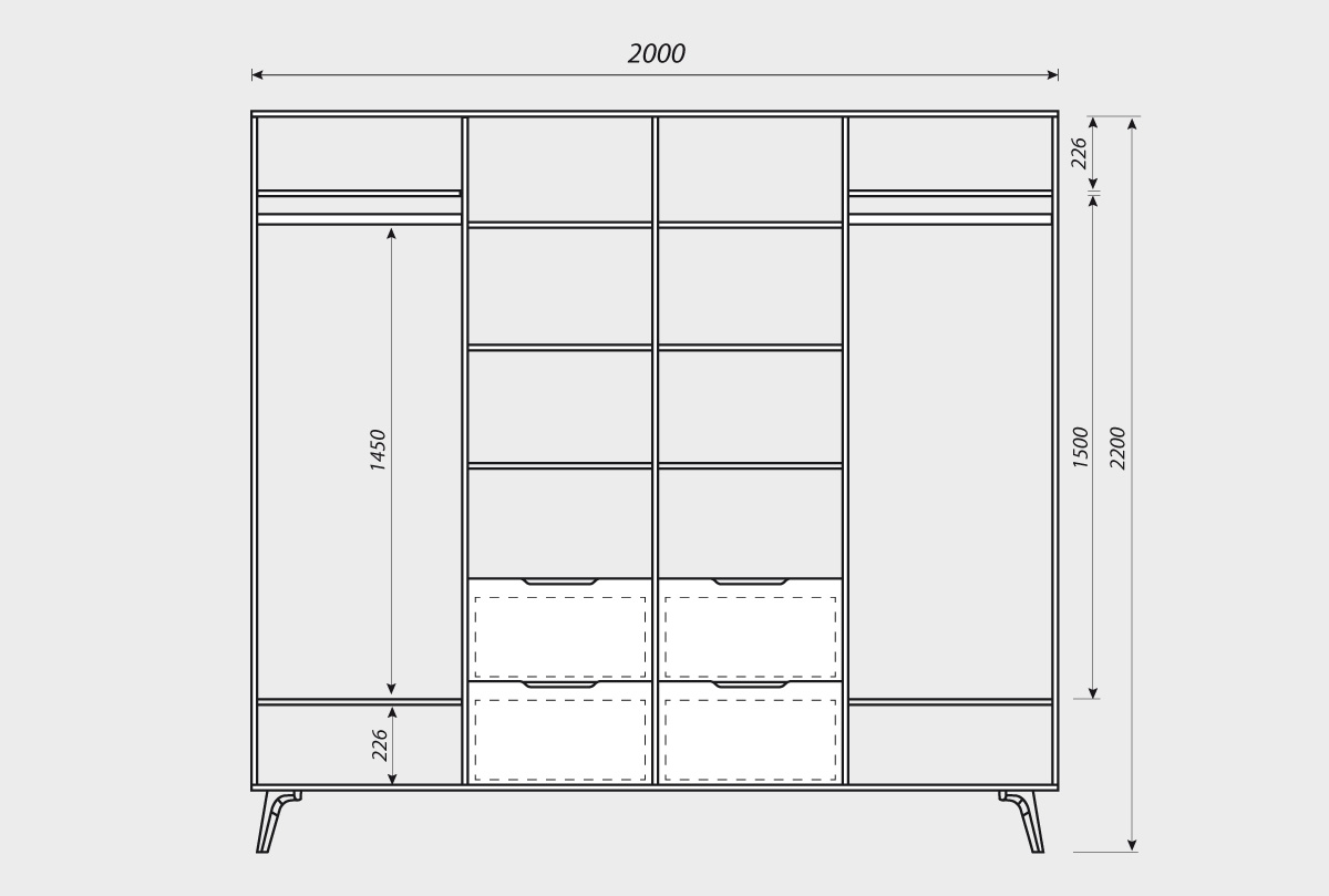 ✅ Внутреннее наполнение шкафа позволяет аккуратно распределить все вещи и поддерживать порядок в нем (по бокам секции: антресоль, штанга, полка в нижней части; по центру: 2 ряда по 4 полки в верхней части и 4 выдвижных ящика в нижней части)
