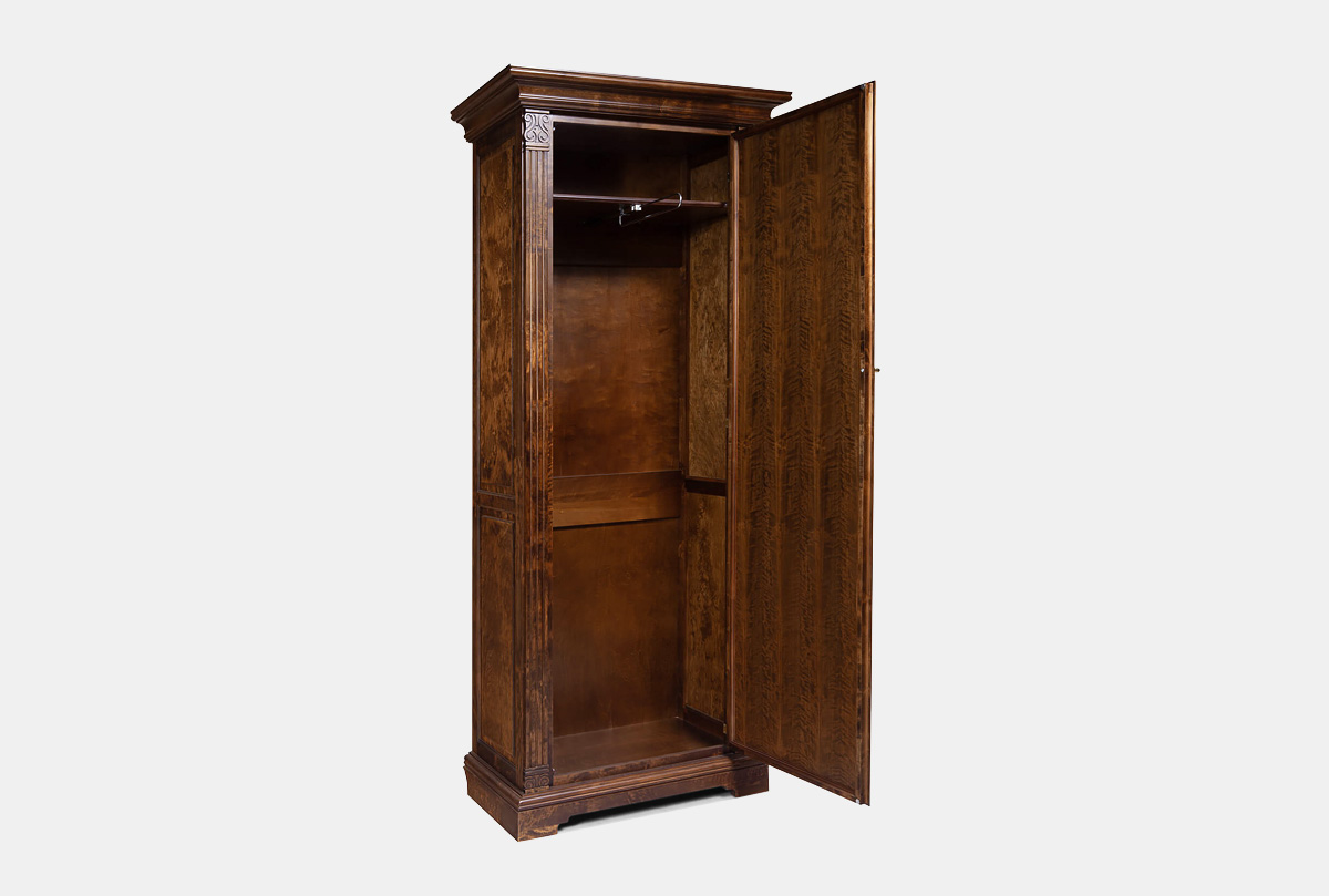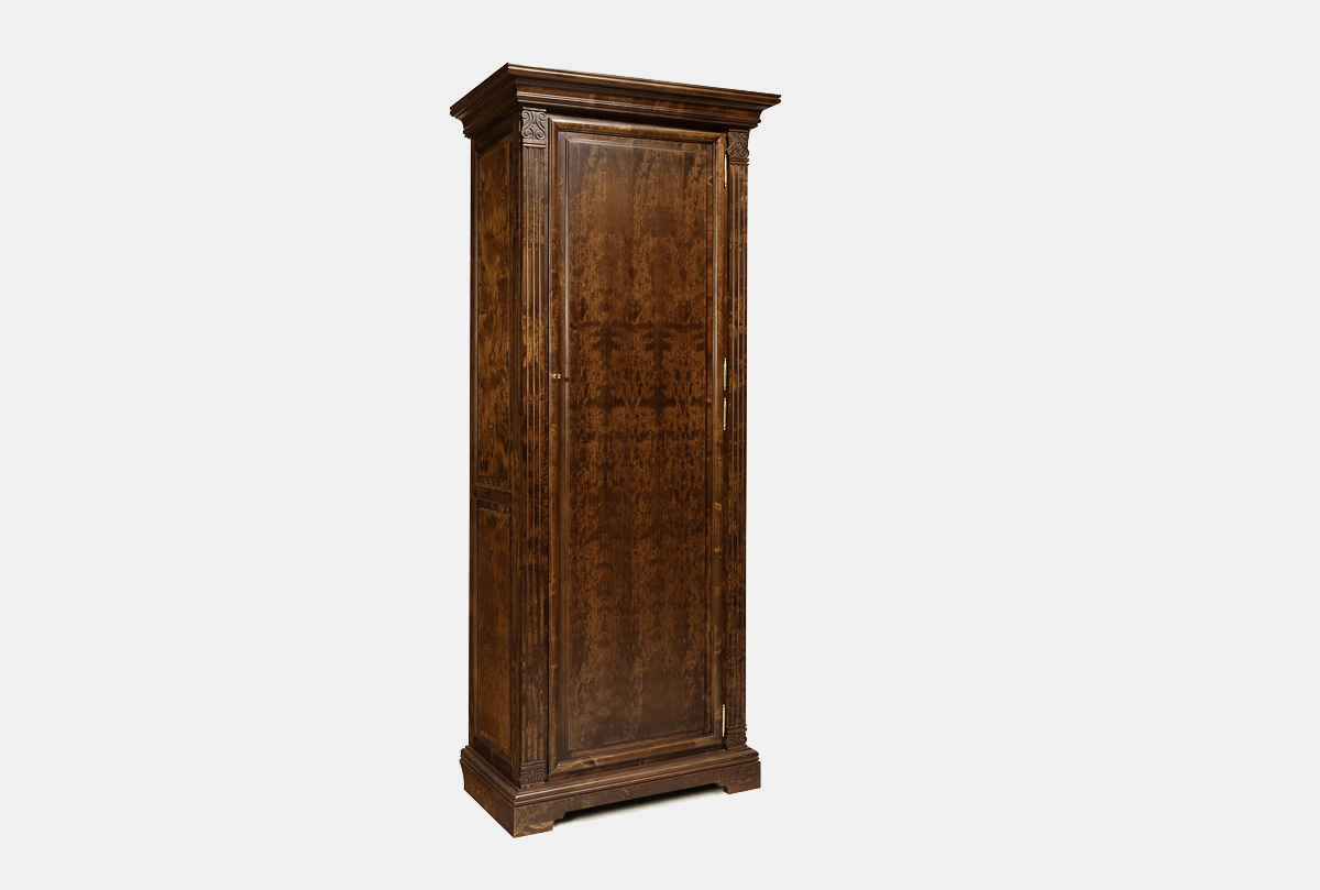 В коллекции натуральной мебели "Престиж" есть изящный и при этом весьма практичный однодверный шкаф для одежды. Величественный, стремящийся ввысь шкаф поможет оптимально расходовать свободное место в гостиной или спальне. Эта роскошная модель из коллекции "Престиж" сделана из массива и шпона берёзы.