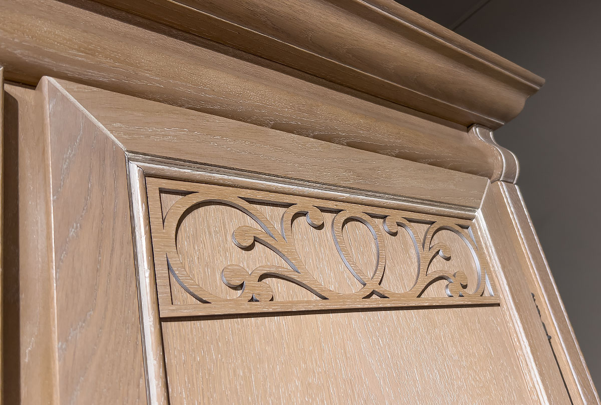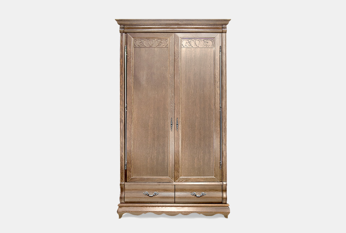 Изящный двухдверный шкаф для одежды «Тэфи» в цвете «амбэр с белой патиной» прекрасно подойдет к классическому и современному интерьеру. Шкаф оснащен выдвижными ящиками, отделением со штангой с левой стороны, а с правой разместились полки. Массивный карниз, нарядная «юбка», утонченная фурнитура и художественная резьба на фасадах – все это придает особый шарм этому шкафу.