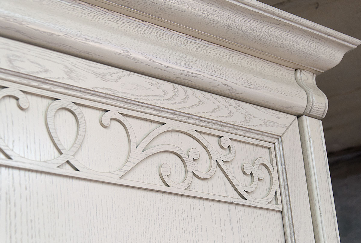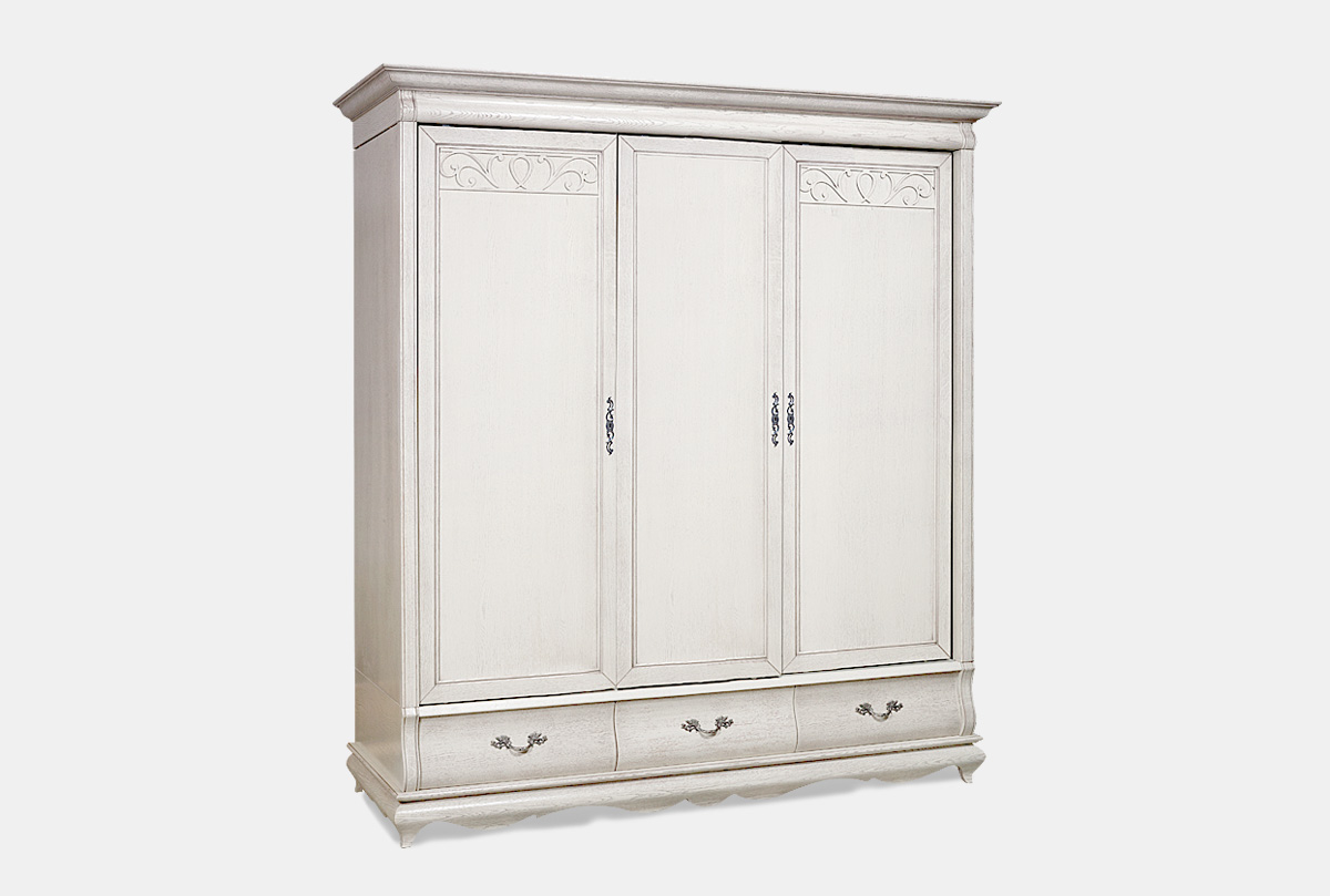 Ценителям классики обязательно понравится этот вместительный трехдверный шкаф без зеркала в цвете «белая эмаль с темной патиной», который поможет украсить спальню и навести порядок среди вещей. Коллекция «Тэфи» сочетает в себе безукоризненное оформление и непревзойденную функциональность каждого предмета.