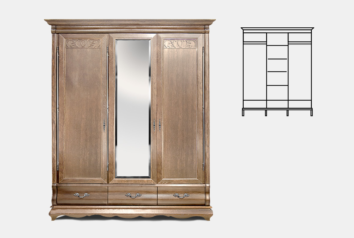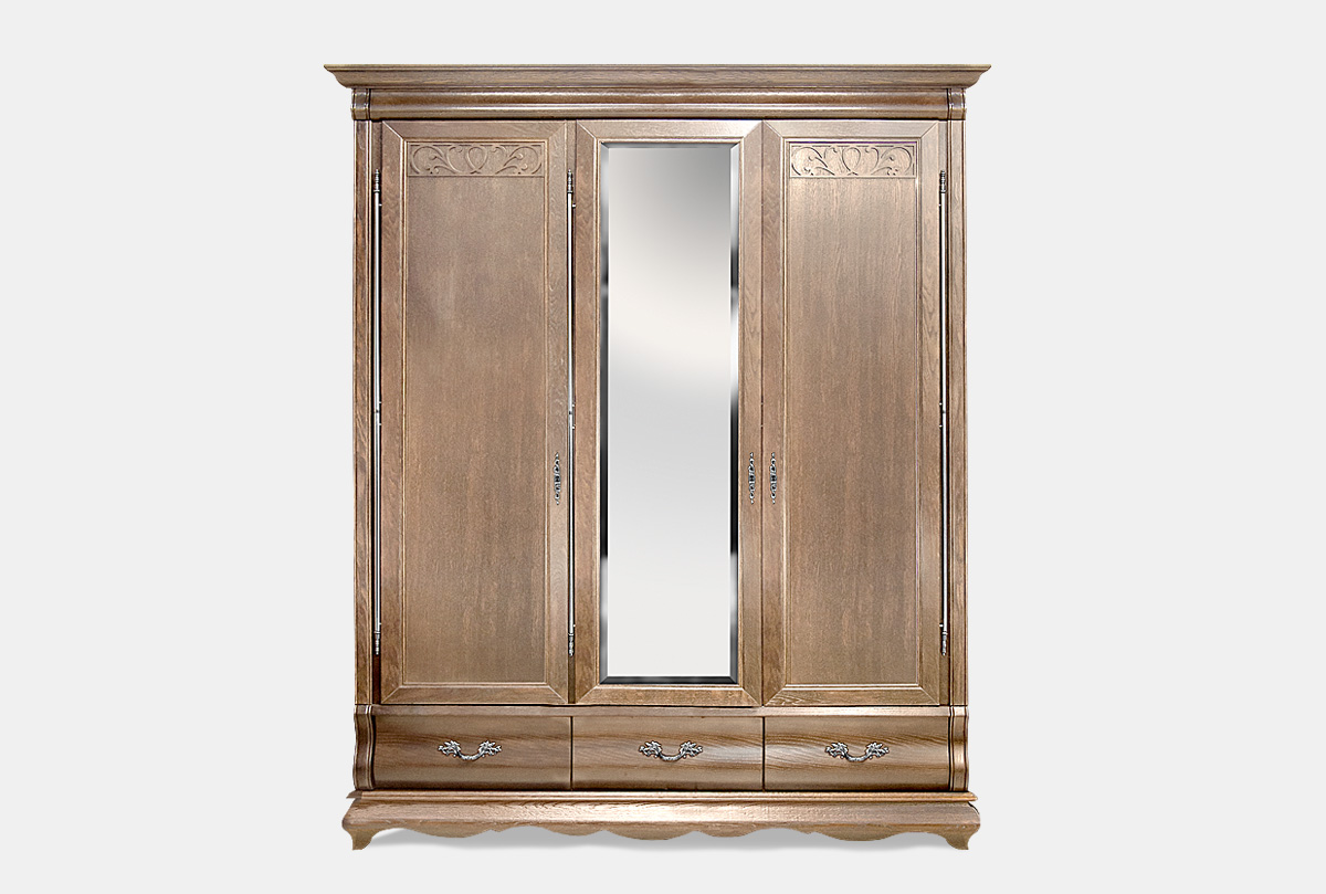 Элегантный трехдверный шкаф для одежды «Тэфи» с зеркалом в цвете «амбэр с белой патиной» выполнен из массива дуба. Изящные изгибы, зеркало на центральной створке, со вкусом подобранная фурнитура придают его виду благородство. Зрительно не стесняя пространство, шкафы цвета «белая эмаль с темной патиной» создают в помещении легкую и умиротворенную обстановку. Также неординарно выглядит шкаф в цветах «амбэр с белой патиной» и «классик».