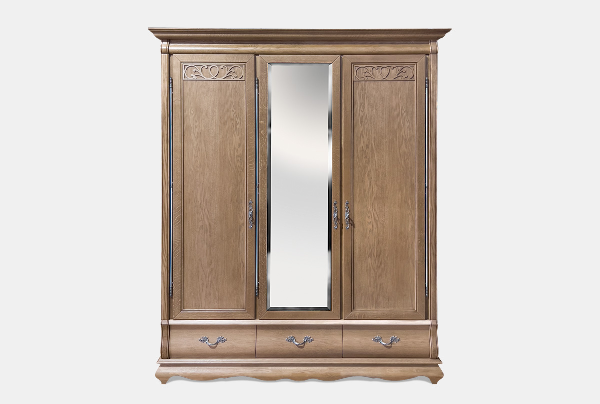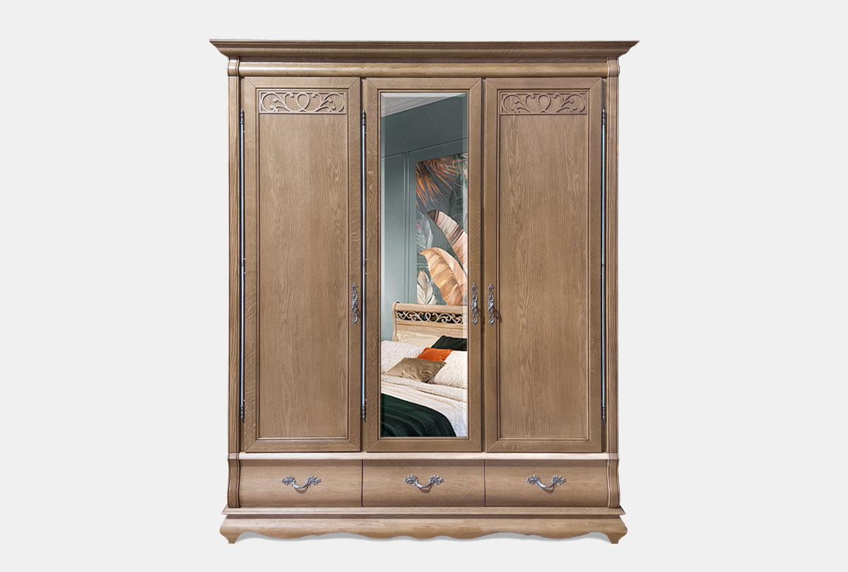 Элегантный трехдверный шкаф для одежды «Тэфи» с зеркалом в цвете «классик» выполнен из массива дуба. Изящные изгибы, зеркало на центральной створке, со вкусом подобранная фурнитура придают его виду благородство. Зрительно не стесняя пространство, шкафы цвета «белая эмаль с темной патиной» создают в помещении легкую и умиротворенную обстановку. Также неординарно выглядит шкаф в цветах «амбэр с белой патиной» и «классик».