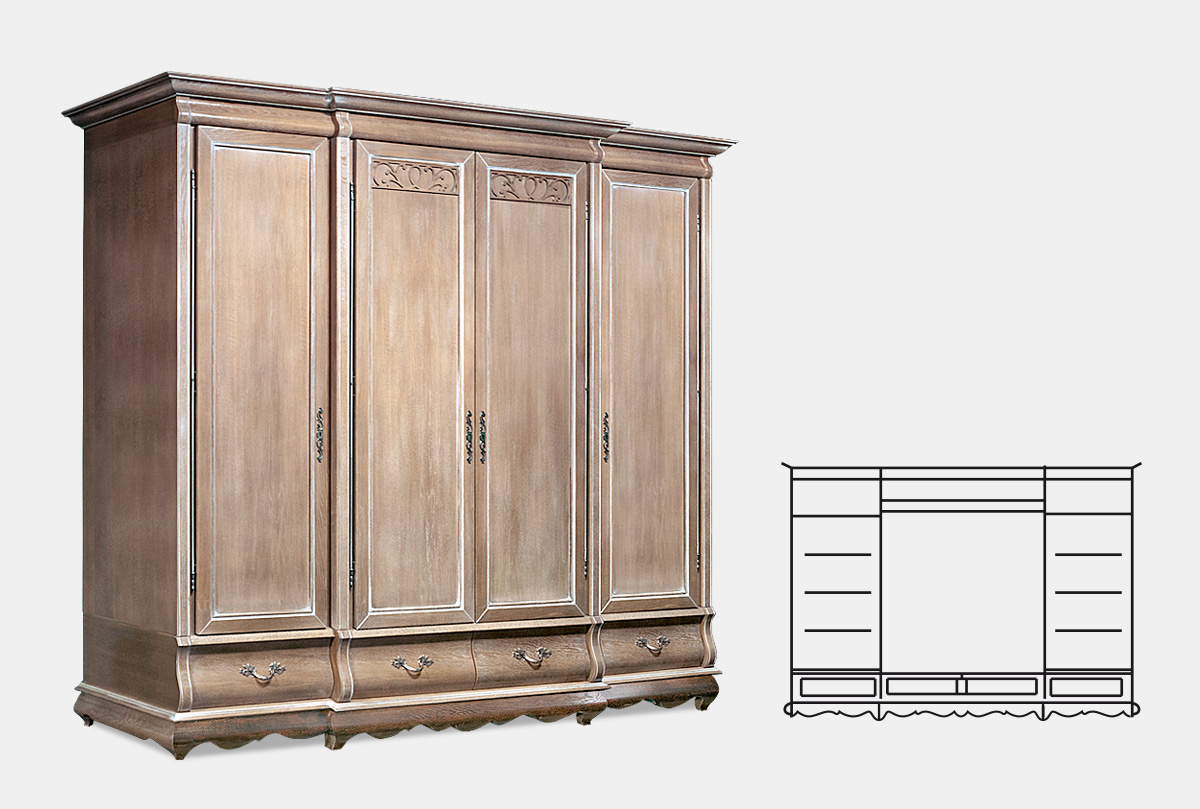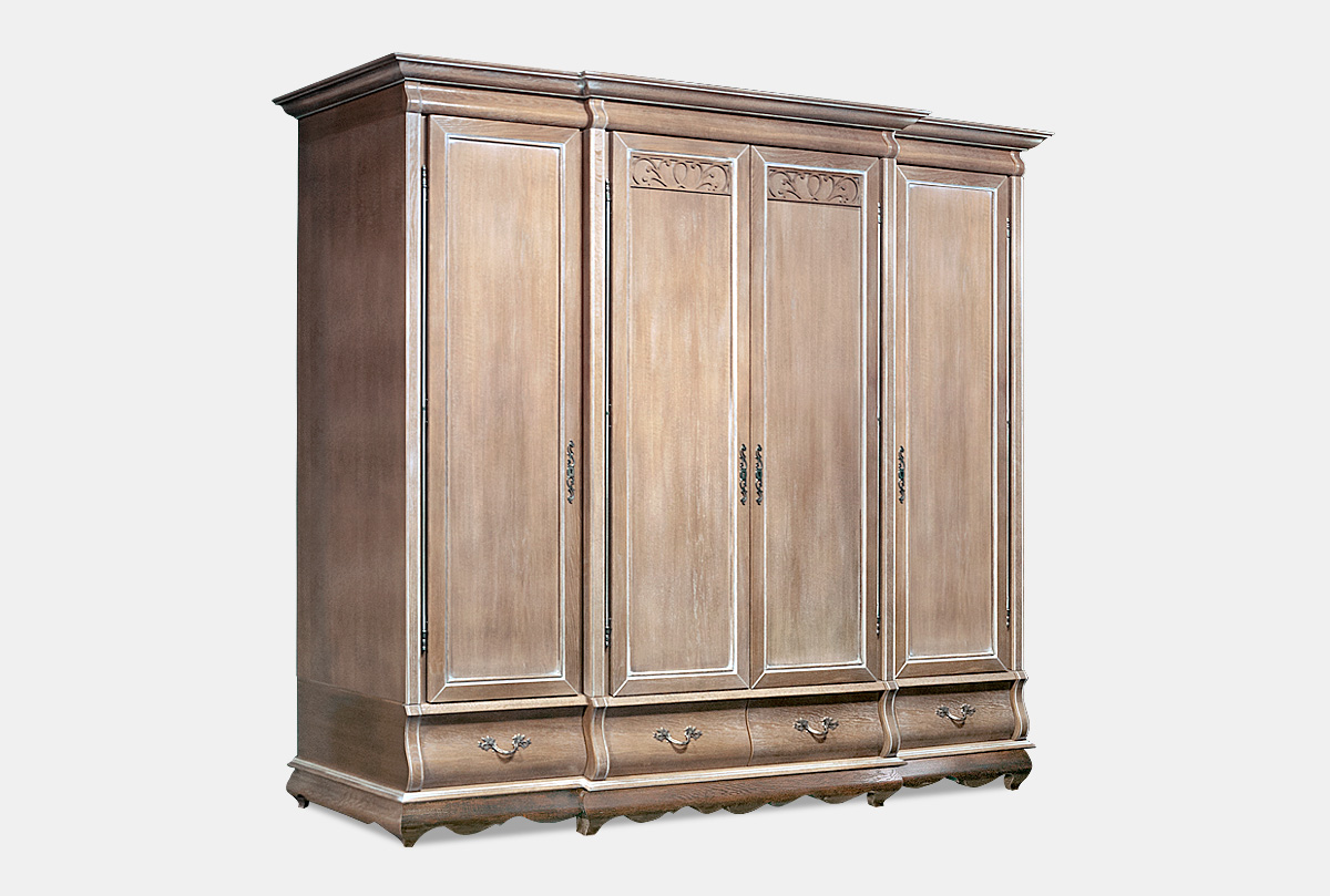 Четырехдверный шкаф для одежды «Тэфи» в цвете «амбэр с белой патиной» преобразит любой интерьер, а привычную повседневность заменит благородство и эстетика. Его плавные формы с волнообразными элементами придадут убранству комнаты естественную утонченность. Шкаф для одежды выполнен из массива дуба и одинаково прекрасно смотрится в трех цветовых вариациях: «белая эмаль с темной патиной», «амбэр с белой патиной» и «классик».
