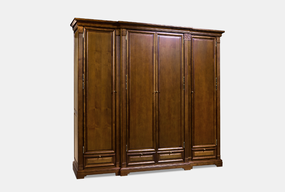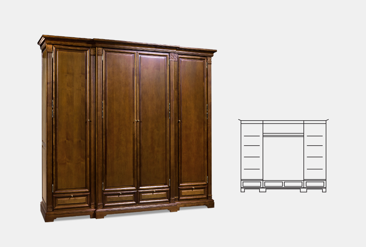 Шкаф для платья и белья "Престиж" 24 - абсолютная мебельная классика. Его главное достоинство — практичность: наравне с распашными дверями шкаф может похвастаться и выдвижными ящиками в нижней своей части. Декоративная резьба украшает боковые лицевые пилястры, превращая шкаф в настоящее произведение мебельного искусства. Фасад шкафа демонстрирует свою натуральную красоту, отражающуюся в четкой текстуре берёзы. Особый шик шкафу придает тонировка в цвете "мокко".