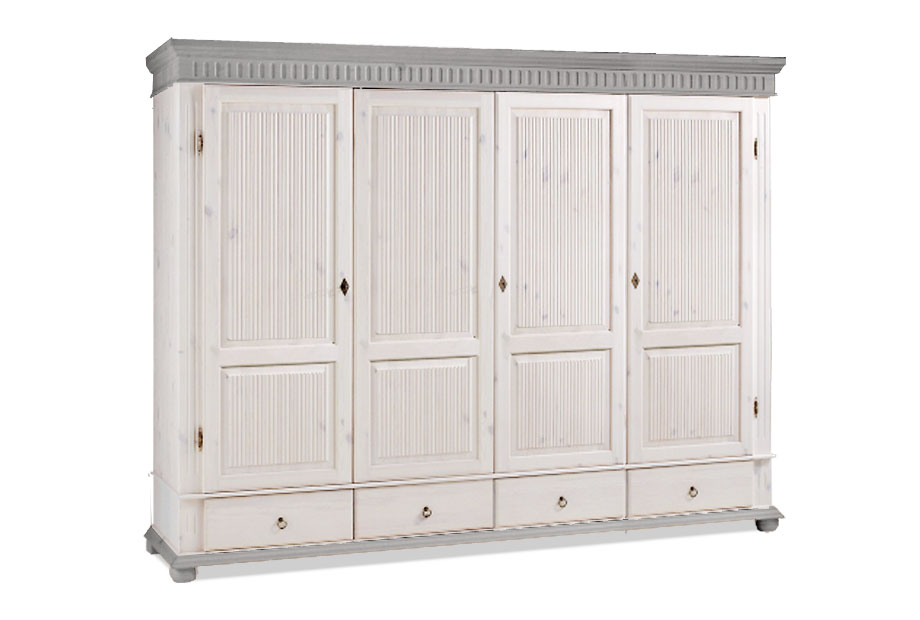 Внушительный шкаф из массива сосны «Хельсинки-4-GT-M» (Helsinki) - это полноценный гардероб, в котором поместится все, что нужно современному человеку. За четырьмя распашными дверями вы найдете 2 отделения на 4 полки каждая и место для хранения одежды со штангой. Вверху также имеется пространство для головных уборов, снизу расположены выдвижные ящики.
