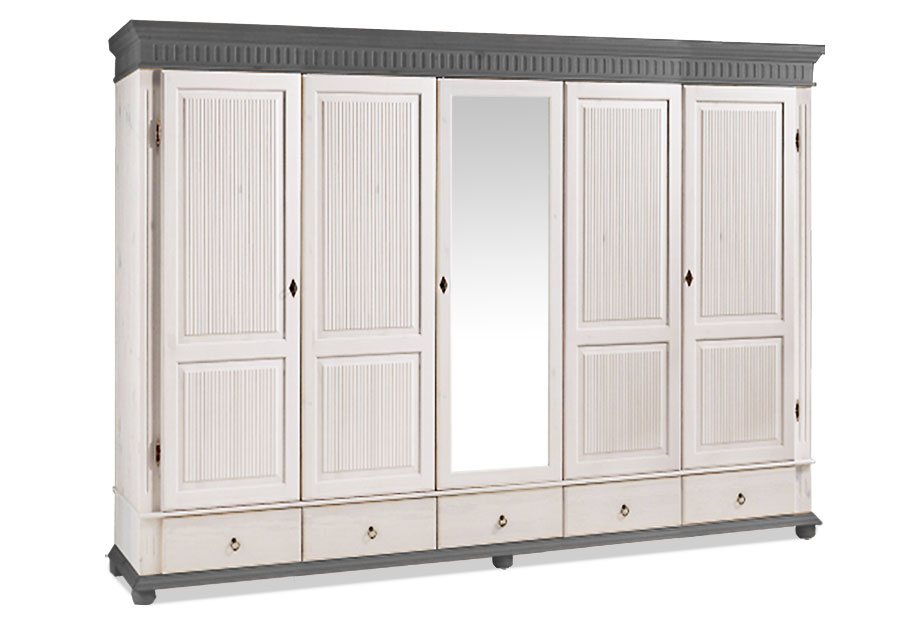 Шкаф «Хельсинки-5-SP-GT-M» (Helsinki) с зеркалом и 5 распашными дверями надежно сохранит вещи для всей семьи. На одну из дверей установлено зеркало в полный рост. Внутри: два отделения для одежды со штангами, несколько полок для остальных вещей и головных уборов. Под каждой дверью находится выдвижной ящик.