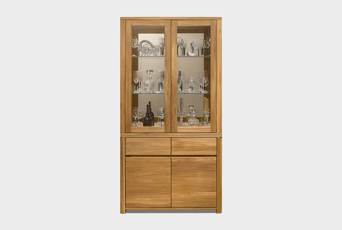 ✅ Шкаф состоит из 2 секций: верхней надставки витрины и функциональной 2-х дверной тумбой.
