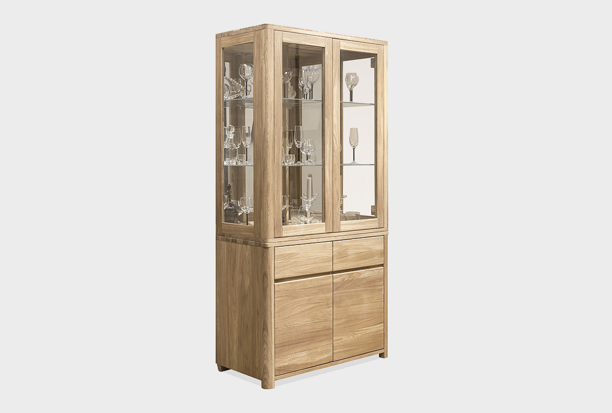 ✅ Шкаф состоит из 2 секций: верхней надставки витрины и функциональной 2-х дверной тумбой.