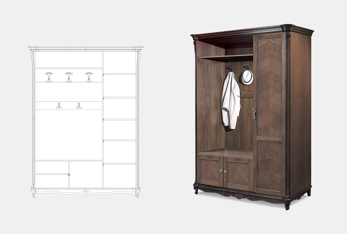 ✅ Правая/левая сторона определяется по расположению крючков. Если Вам необходимо, чтобы крючки были с правой стороны, вам нужно выбирать правый шкаф.