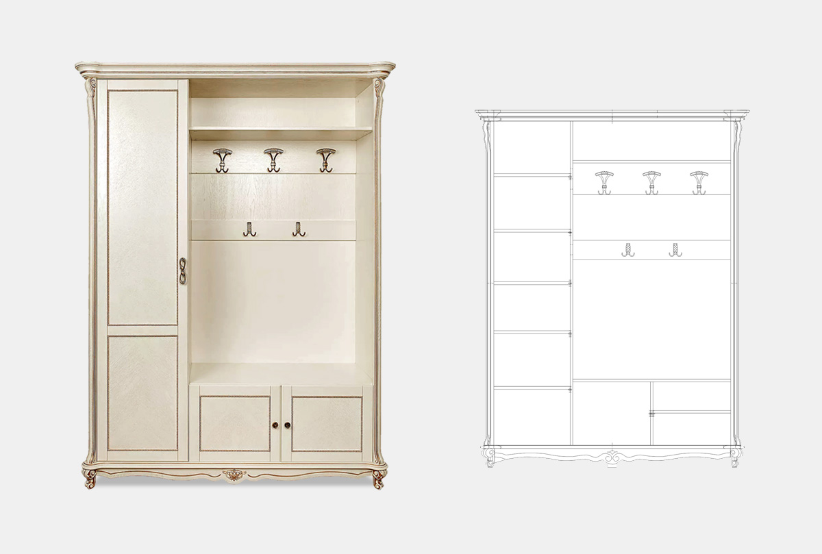 ✅ Правая/левая сторона определяется по расположению крючков. Если Вам необходимо, чтобы крючки были с правой стороны, вам нужно выбирать правый шкаф.