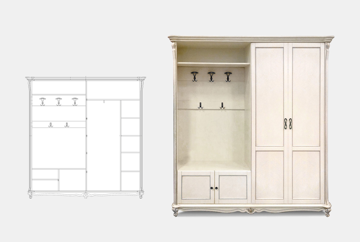 ✅ Правая/левая сторона определяется по расположению крючков. Если Вам необходимо, чтобы крючки были с правой стороны, вам нужно выбирать правый шкаф.