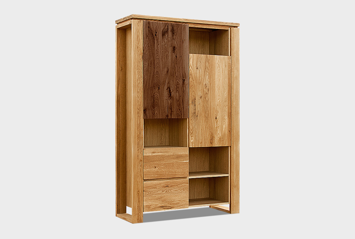 Оригинальным решением в исполнении комбинированного шкафа «Берген» В-224 в цвете «бейц-масло, графит» стала комбинация открытых ниш и закрытых отделений с полками. Свойственное стилю Лофт отсутствие фурнитуры никак не сказалось на функциональности, фасады оборудованы специальными углублениями, благодаря чему дверцы и ящики легко открывать. Шкаф выполнен из натурального дуба, обработанного бейц-маслом.