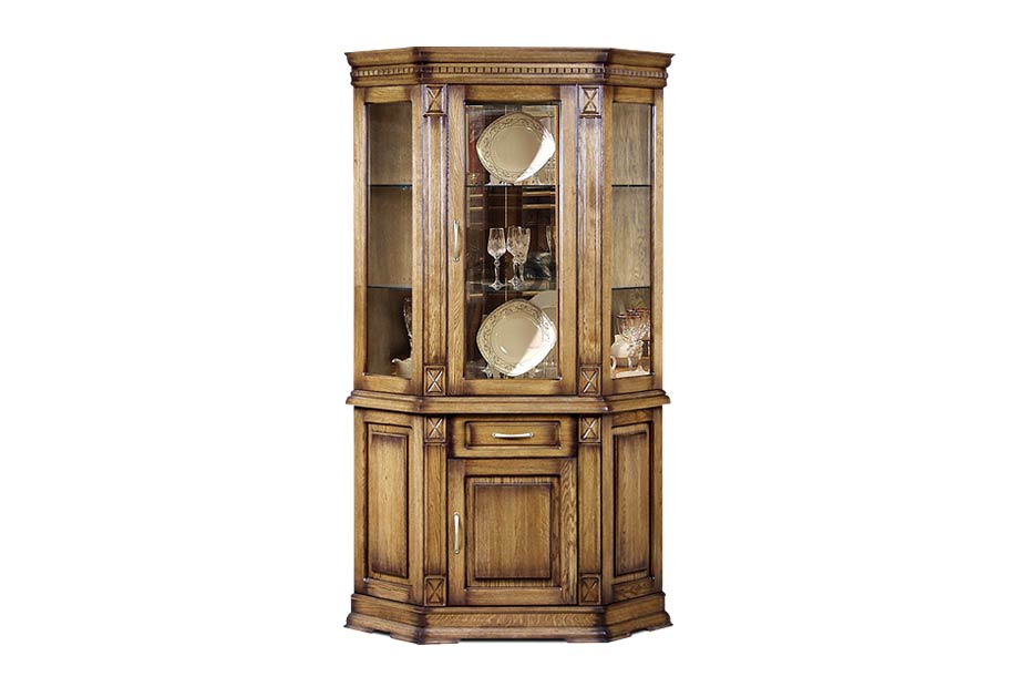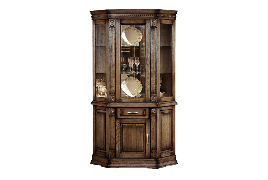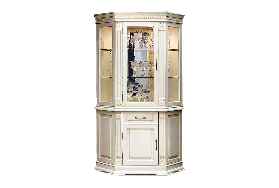 Угловой шкаф из коллекции «Верди» - это стильное решение для интерьера, оформленного в классическом стиле. Стеклянные фасады в сочетании с зеркальными полками и задней стенкой создадут красивую игру света. Благодаря этому, хрустальные бокалы, которые Вы можете поставить на полки, заиграют новыми красками. В выдвижном ящике и нише за дверцей Вы сможете спрятать личные вещи и легко поддерживать порядок в комнате. Декоративные элементы в виде резных пилястр и фигурного цоколя придают шкафу торжественности и утонченности, свойственных классике.